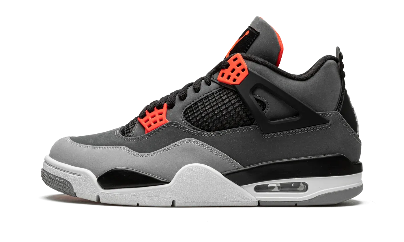 The Air Jordan 4 "Infrared" is a February 2021 release of the vintage basketball shoe in a colorway loosely inspired by the Chicago Bulls, Michael Jordan's former basketball team. The "Infrared" Jordan 4 also mimics the color block of the model's "Green Glow" colorway from 2013, trading the latter's green accents for Infrared. The shoe features a synthetic nubuck upper in light and dark grey. Black accenting can be found on the netting found on the tongue and mid-panel, on the "wings," and inner lining. Lighter shades of grey appear on the toe and outsole. A light grey Jumpman is located on the black heel counter and an Infrared Jumpman is printed on the black nylon tongue tag on the tongue. Additional Infrared detailing is found on the eyelets. Underfoot, a visible Air bubble in the white midsole completes the look. Release date: February 8, 2022
