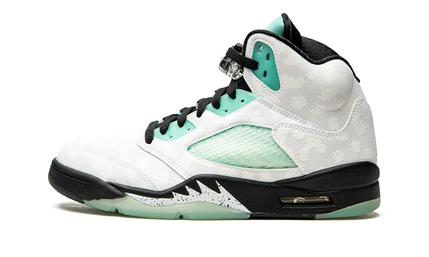 The Air Jordan 5 "Island Green" is inspired by the warm, tropical vibes of island beaches with its light green accents. Michael Jordan's fifth signature Nike basketball shoe features a premium white leather constructed upper with glossy tonal cheetah spots printed into the design. Soothing Island Green eyelets and netting on the mid-panel and tongue contrasts the sleek upper. An embroidered light green Jumpman covers the heel with black laces and a clear lace lock adding the finishing touches to the upper. The midsole goes all black with white speckled "teeth" detailing, and the translucent rubber portions of the outsole also feature the tropical green hue. Release date: November 11, 2019.