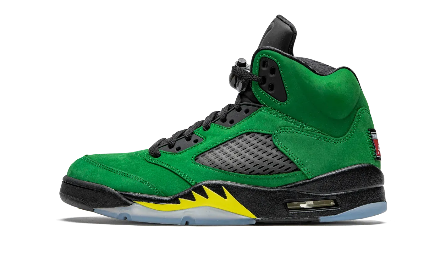 The Air Jordan 5 "Oregon" honors the Oregon Ducks as Jordan Brand celebrates the 30th anniversary of Michael Jordan's legendary fifth signature shoe in 2020. Devoid of any Ducks branding, the colorway nonetheless graciously employs the school's familiar green, yellow, and black color scheme. Save for the smoky translucent netting found on the mid-panel and tongue, the entire upper is cast in green suede for a bold and unique appearance. Additional styling includes black laces, a semi-translucent lace lock with Jumpman detailing, and embroidered "Team Jordan" patch on the heel. The black leather tongue displays a tonal embossed Jumpman logo and the black rubber midsole features yellow accented shark tooth detailing on top of an icy blue translucent outsole. Release date: September 12, 2020.