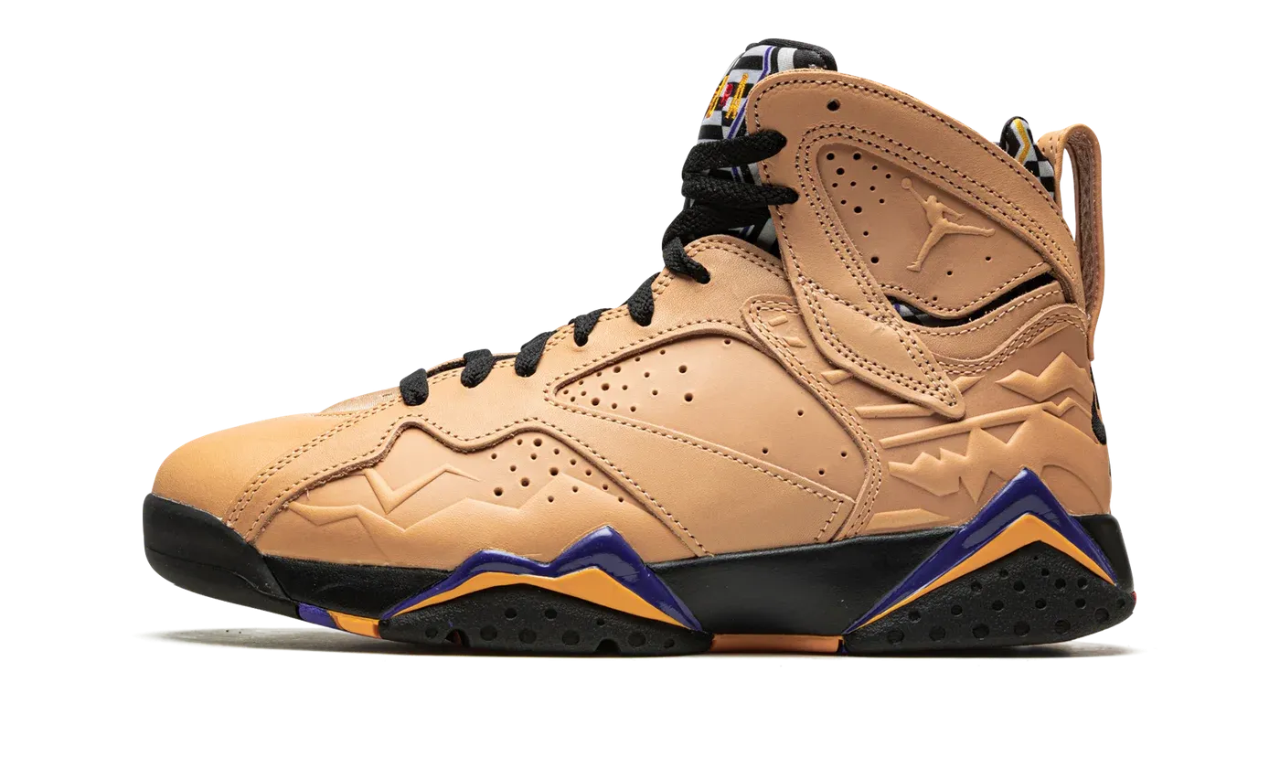 The Air Jordan 7 "Afrobeats" is a colorway of Michael Jordan's seventh signature shoe that nods to the vibrant music of West Africa. The Jordan 7 celebrated its 30th anniversary in 2022 by returning in original and non-original colorways, like this creative "Afrobeats" makeup. A Vachetta Tan leather construction highlights the shoe's design. Debossed detailing appears on the forefoot and heel. The Jordan 7's signature neoprene bootie is updated with a black-and-white geometric pattern. Classic, original "Nike Air" branding appears on the heel, a nod to the original look of the Air Jordan 7. Underfoot, purple and gold accents contrast the black painted midsole. Release date: October 22, 2022