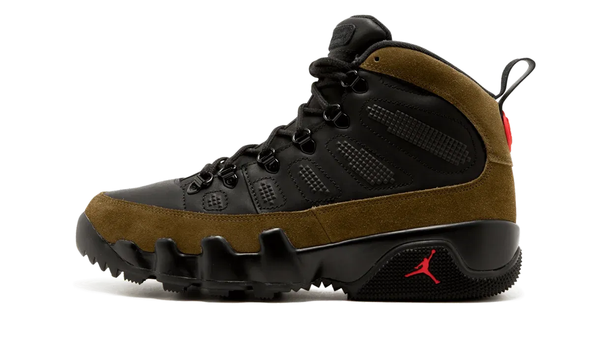 The Air Jordan 9 Boot "Olive" is the winterized construction of the Air Jordan 9 Retro in its original "Olive" colorway. The Air Jordan 9 is beefed up to protect your feet from winter weather in style. The Jordan 9 features an insulated upper in premium leather and suede with a water-repellent coating. The outsole is upgraded with extra traction to keep you stable in wet and icy conditions. This colorway is inspired by the original "Olive" Jordan 9 from 1994, replicating the look with black leather and olive-colored suede with red accents. The Air Jordan 9 Boot "Olive" released in fall 2018.