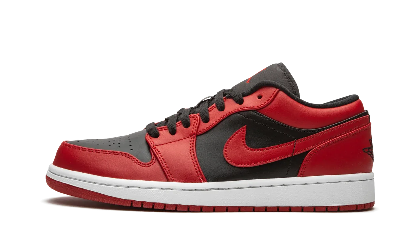 The Air Jordan 1 Low "Reverse Bred" rearranges the classic "Bred" color scheme on Michael Jordan's first signature model in low-top height. The famous "Bred," or black and red, colorway was one of several original makeups of the Jordan 1 worn by Michael during the early stages of his time with the Chicago Bulls. Years after its release, it still shines as one of the very best Air Jordan designs ever. This "Reverse Bred" flips the look by employing black leather on the perforated toe and mid-panel. Red leather overlays appear on the forefoot, eyelets, collar, and heel. Branding appears in the form of a red leather Swoosh on either side, black embroidered "Wings" detailing on the heel, and a mini red Jumpman stitching on the black nylon tongue. Tonal laces and a black liner add depth to the design. As a whole, the Air Jordan 1 Low "Reverse Bred" is reminiscent of the "Varsity Red '85" colorway used on the Jordan 1 High.