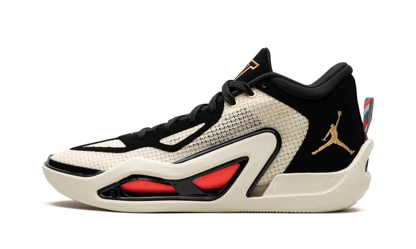 The Jordan Tatum 1 "Barbershop" is a colorway of Jayson Tatum's first signature shoe with Jordan Brand inspired by a memorable quote by Tatum from 2019: "When I get a cut, I think I'm Top 5." The "Barbershop" Tatum 1 features a cream white mesh construction with overlaying black synthetic nubuck panels. A Metallic Gold Jumpman is found on the side of the heel. The left shoe features red detailing on the midsole's mesh "windows," while the right shoe adds blue accents in the same areas. Additional gold accenting is found on the "JT" embroidery on the tongue. Striped detailing inspired by barber shop poles lands on the heel tab. Release date: May 12, 2023