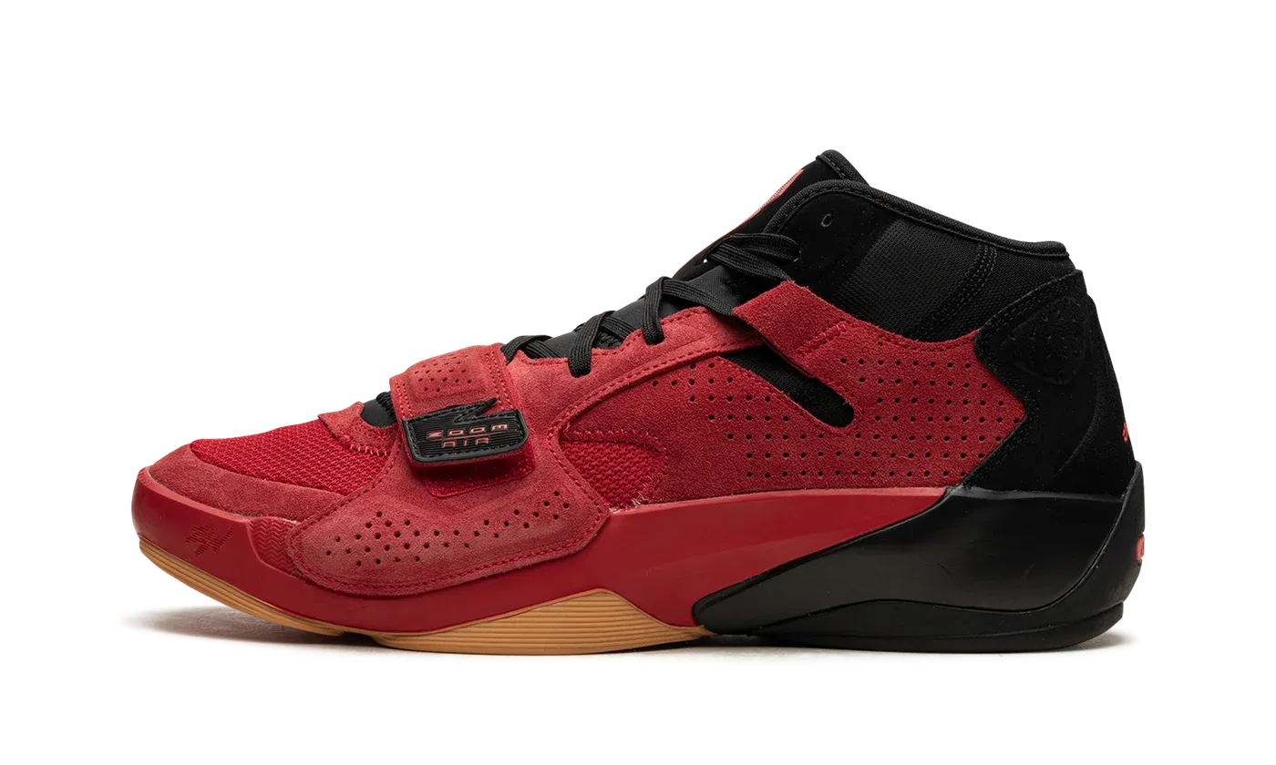 The Jordan Zion 2 "Raging Bull" is a colorway of basketball star Zion Williamson's second signature shoe with Jordan Brand inspired by a classic Air Jordan shoe. The sneaker we're referring to is the Air Jordan 5 "Raging Bull" that was originally released in 2009 as part of the "Defining Moments Pack." That sneaker, like Zion's Jordan Zion 2, features a red suede construction. The Jordan Zion 2 combines other colors and materials, though, for an update on the popular "Raging Bull" theme. More specifically, the shoe has a University Red mesh toe contrasted with red suede overlays throughout the design. Both the collar and heel have a combination of black suede and mesh. A red Jumpman is embroidered on the heel. "Zoom Air" branding is found on the red suede midfoot strap. Zoom Air technology is placed in the forefoot of the midsole.