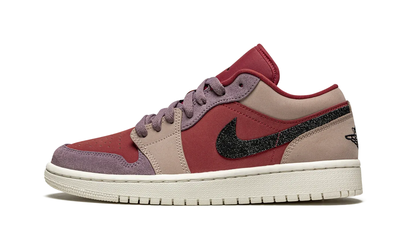 The Women's Air Jordan 1 Low "Canyon Rust" is a women's version of Michael Jordan's first signature shoe in a unique mix of tones. Yet another vibrant look for the popular low-top Jordan 1, the "Canyon Rust" features synthetic nubuck panels in Canyon Rust on the perforated toe and on the mid-panel and on the nylon tongue. Beige overlays appear on the forefoot, lower eyelets, collar, and heel. Elsewhere, buttery Purple Smoke suede detailing can be found on the toe cap and upper eyelets and the same shade of dusty purple is used on the laces. A black Swoosh with glitter speckling appears on either side and a black "Wings" logo is embroidered on the heel.