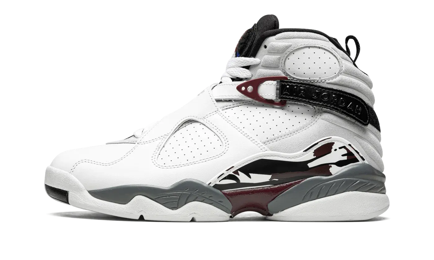 The Women's Air Jordan 8 "Burgundy" is a women's exclusive colorway of Michael Jordan's eighth signature shoe that features an autumnal vibe. Sporting a neutral vibe throughout its design, the Jordan 8 "Burgundy" is a must-have for fans of classic performance inspired footwear. Smooth white leather forms the base of the upper and is visible on the toe and dotted paneling on either side. Subtle Neutral Grey suede can be found on the collar and the back of the shoe. Additional design elements include white leather criss-cross straps with "23" branding, a black adjustable ankle strap, and a multicolored chenille Jumpman on the tongue. A white, grey, and burgundy print on the mudguard finishes off the look of the Women's Air Jordan 8 "Burgundy." Release date: December 4, 2020.