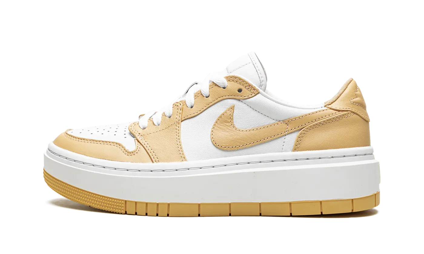 The Women's Air Jordan 1 Elevate Low "White/Tan is an updated style of the Air Jordan 1 featuring a chunky platform sole and a simple two-toned colorway. This platform Air Jordan 1 is constructed with a white leather base that extends to the tongue and liner. Light tan leather overlays cover the white panels, including the Swooshes. Finishing details include a white midsole, tan rubber outsole, the Jordan wings logo on the heels, white laces and cork insoles.