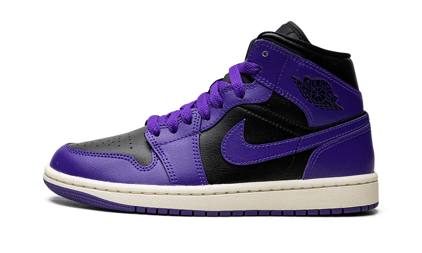 The Women's Air Jordan 1 Mid "Black/Purple" is a women's-exclusive colorway of the popular lifestyle shoe in a two-tone, purple and black design. A head-turning look for the Jordan 1 Mid, the "Black/Purple" features a black leather base with contrasting Concord-colored leather overlays and Swoosh branding. A black "Wings" logo appears on the collar while a purple Jumpman is found on the tongue tag. Underfoot, the shoe is complete with a Sail rubber midsole that gives the shoe a vintage look and a Concord outsole. Release date: August 27, 2022