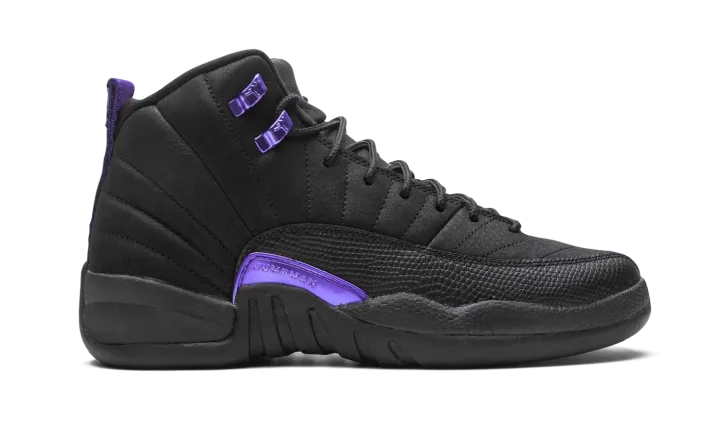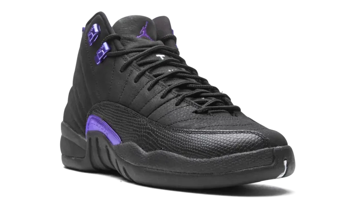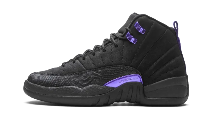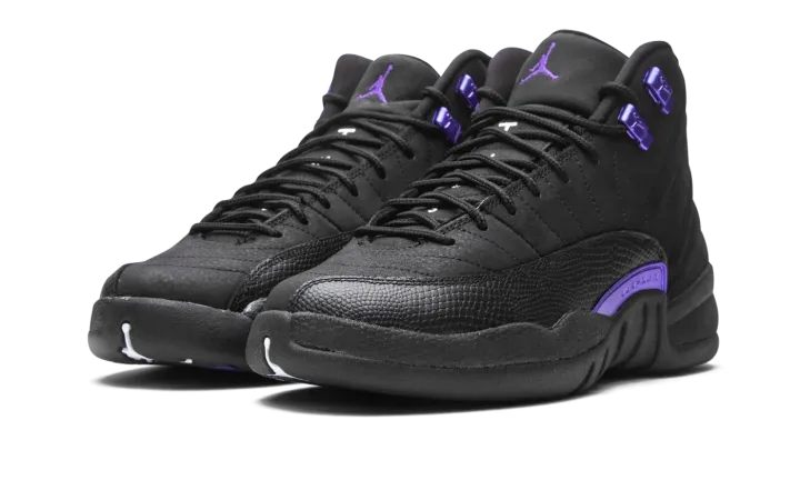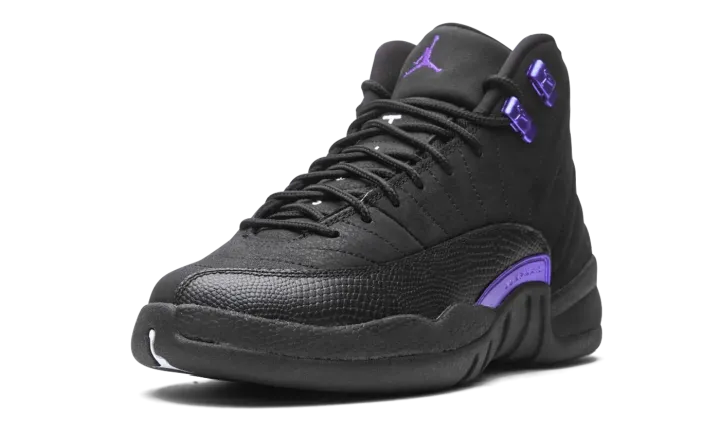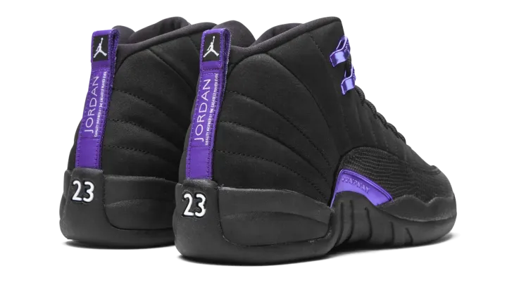 The Air Jordan 12 GS "Dark Concord" is the youth sizing of Michael Jordan's twelfth signature shoe inspired by former Player Exclusive models. Although not officially associated with the Sacramento Kings or Los Angeles Lakers (or Phoenix Suns,) the "Dark Concord" mirrors the many exclusive colorways worn by Team Jordan members Mike Bibby, Mitch Richmond, and even Kobe Bryant during his sneaker free agency tour of the early 2000s. The versatile "Dark Concord" features a black synthetic nubuck material across the upper and a faux lizard skin material on the forefoot and toe. Metallic Dark Concord accenting can be found on the top lace eyelets, Jumpman plate above the midsole, and on the Jumpman embroidery on the black nubuck tongue. The word "Two 3" is embroidered in white text on the tongue, as well. A purple nylon overlay appears on the back of the shoe and features the classic "Quality Inspired by the Greatest Player Ever" branding per the original Air Jordan 12 design from the '90s. Release date: October 23, 2020.