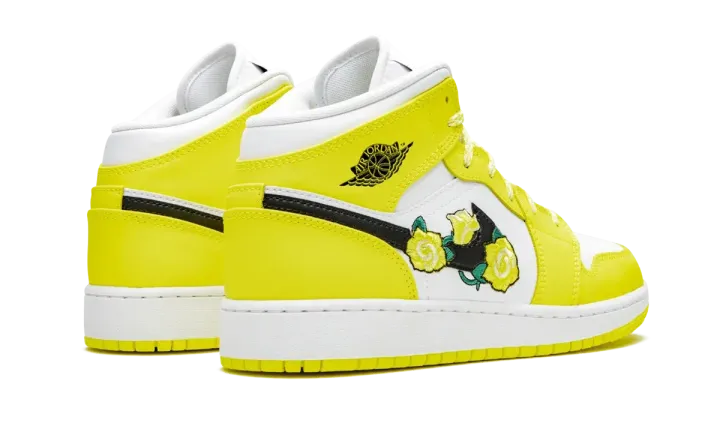 The Air Jordan 1 Mid GS "Dynamic Yellow Floral" is a kids-only colorway that will catch eyes on the playground and the hallways at school. With leather Dynamic Yellow overlays that live up to the color's name on top of a white leather base, these shoes are definitely ready to grab attention. Even more bold are the yellow roses putting down roots on the classic black Swoosh logo. With green stems and leaves and a black outline, the roses look ready to be plucked right off the shoe. Pastel yellow laces, black wings and Jumpman logos, a white midsole, and a matching yellow outsole complete the look.