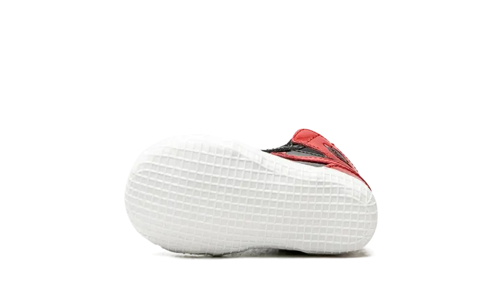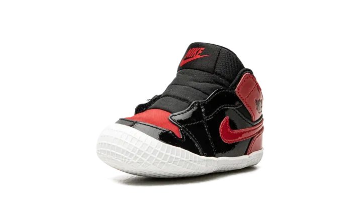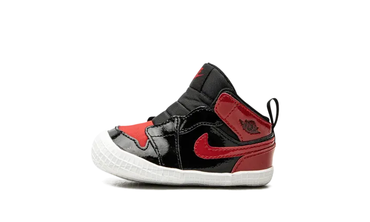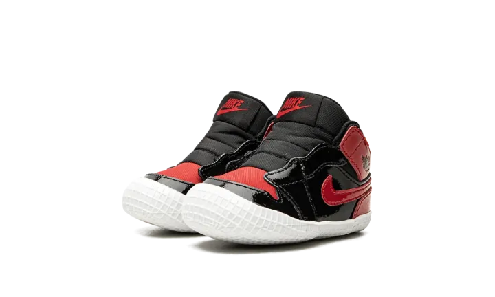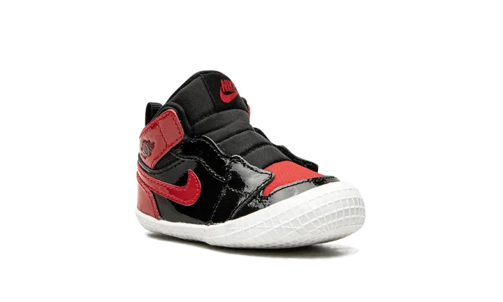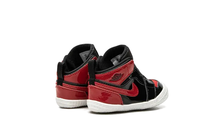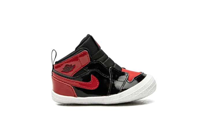 The Jordan 1 High Crib Bootie "Patent Bred" is the infant sizing of the popular black-and-red colorway of the vintage basketball shoe that was released in December 2021. The "Patent Bred" version of Michael Jordan's first signature shoe is based on the model's original "Bred" colorway, the style that first appeared on the Nike Air Ship then Air Jordan 1 in the mid-80s. Both shoes in the "Bred" colorway were "banned" from the NBA, and subsequently the centerpiece of Nike's "Banned" campaigns featuring Jordan wearing the shoe. The "Patent Bred" puts a modern spin on the look with glossy patent leather instead of the traditional leather found on the original "Bred." Black patent leather appears on the forefoot, eyelets, and mid-panel. Contrasting Varsity Red leather is found on the collar, heel, and Swoosh. Release date: December 30, 2021