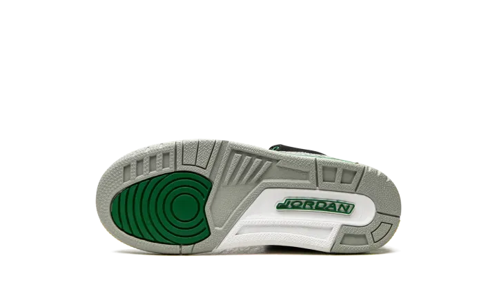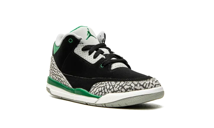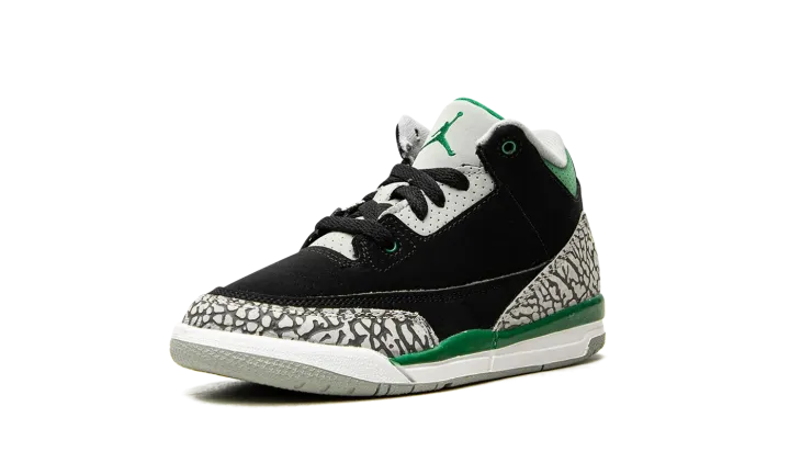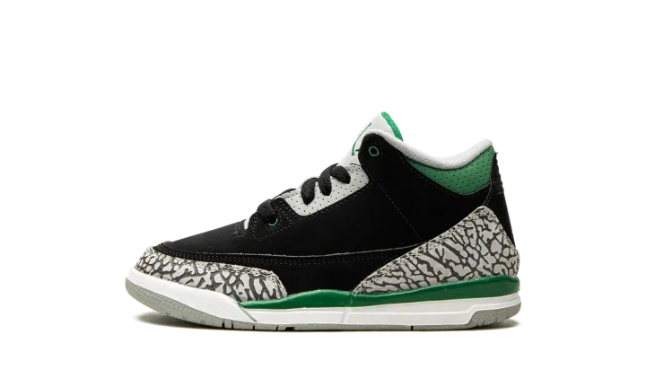 The Air Jordan 3 PS "Pine Green" is the preschool version of the Oregon Ducks-inspired colorway of Michael Jordan's first signature shoe. A Fall 2021 release, the "Pine Green" is inspired by various unreleased Player Exclusive Air Jordan and Nike shoes given to student athletes and facility members of the Oregon Ducks. Black synthetic nubuck covers the base of the shoe. Perforated Pine Green leather appears on the collar and dotted grey leather is located on the eyelets. Contrasting elephant prints on the toe and heel bring a decidedly retro look to the Jordan 3. A Pine Green Jumpman is embroidered on the grey leather tongue and a grey Jumpman appears on the heel. Finishing touches include a green painted mudguard, white foam midsole, and grey outsole. Release date: October 30, 2021