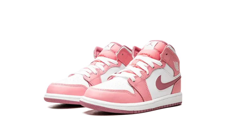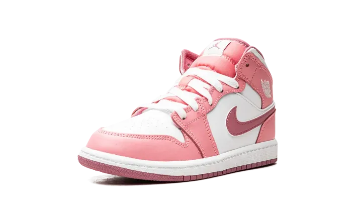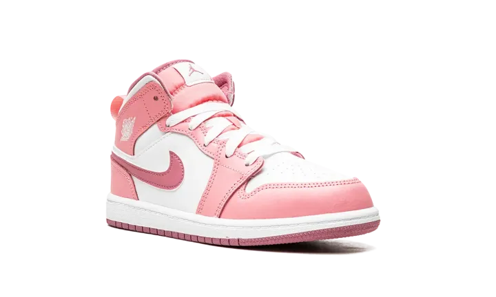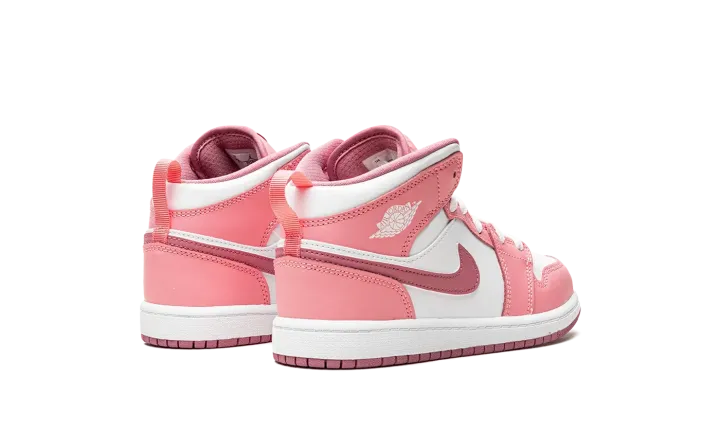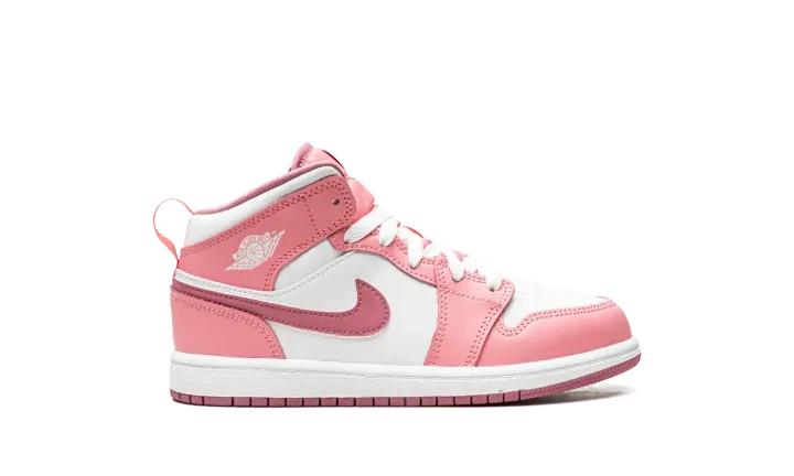 The Air Jordan 1 Mid PS "Valentine's Day 2023" is the preschool sizing of the mid-top sneaker in a colorway inspired by the February holiday. The shoe features a white leather base contrasted with pink leather overlays. A slightly darker shade of pink leather is used on the Swoosh logo on the sides. Additional branding includes a white "Wings" logo on the collar and a Jumpman on the tongue tag. Underfoot, a white rubber midsole and pink outsole complete the look. Release date: March 21, 2023