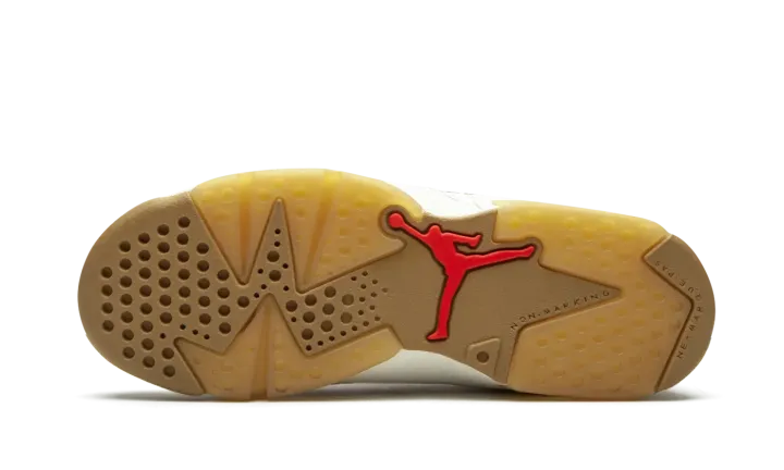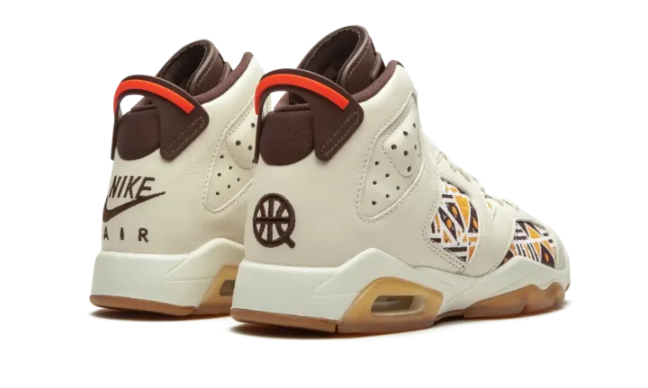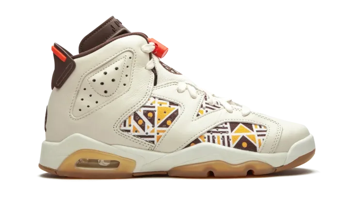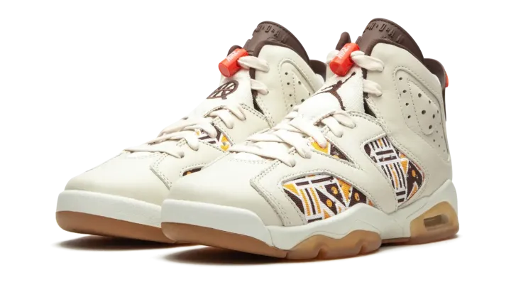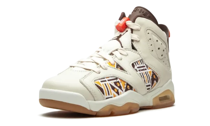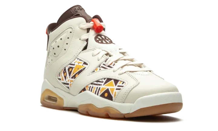 The Air Jordan 6 GS "Quai 54" is the grade school sizing of the design that coincides with Jordan Brand's annual streetball tournament in Paris, France. This colorway of Michael Jordan's sixth signature shoe features a Sail leather base with patterned textile panels on either side. Brown Jumpman embroidery appears on the cream colored nylon overlay on the tongue. A red lace toggle with white Jumpman branding and dual-branded "Nike Air" and "Quai 54" dots the left and right heel, respectively.
