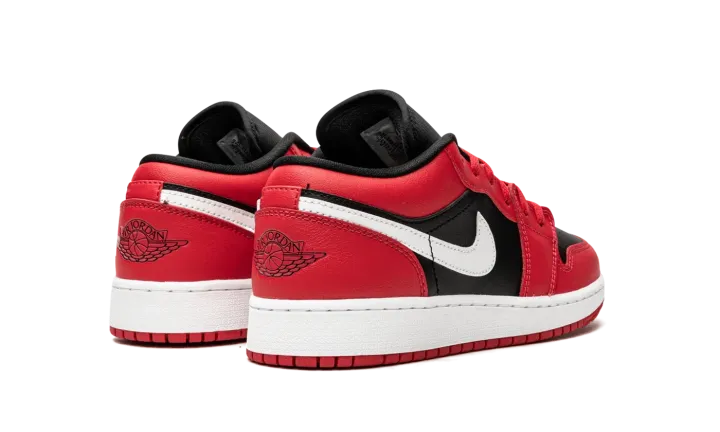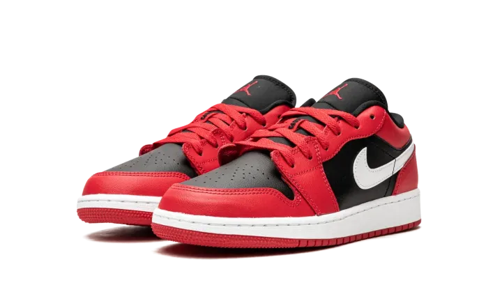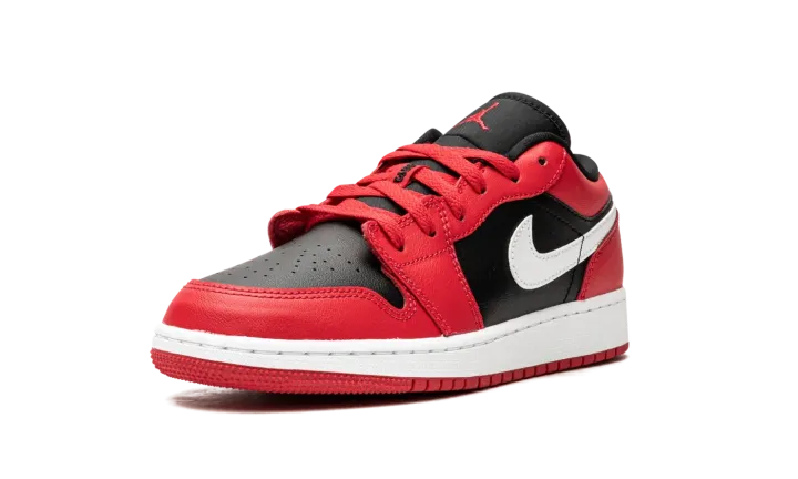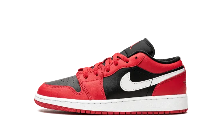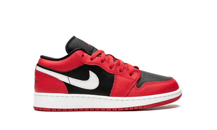 The Air Jordan 1 Low GS "Black/Very Berry" is the youth sizing version of Michael Jordan's first signature shoe in a colorway that honors the Basketball Hall of Famers' run with the Chicago Bulls. Appearing on the silhouette's low-top model, the "Black/Very Berry" presents a new way for Jordan Brand to show love to the Bulls and Jordan's many memorable moments with the NBA franchise. Black leather can be found on the perforated toe and mid-panel. Contrasting Very Berry leather panels on the forefoot, eyelets, collar, and heel balance out the look. A white leather Swoosh appears on both sides of the shoe and a black "Wings" logo dots the heel. A red Jumpman is embroidered onto the black nylon tongue and black "23" detailing can be found on the lace overlay incorporated into the design of the red laces.