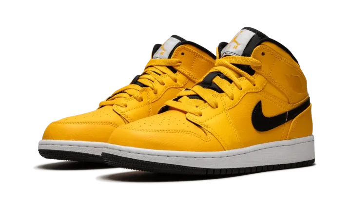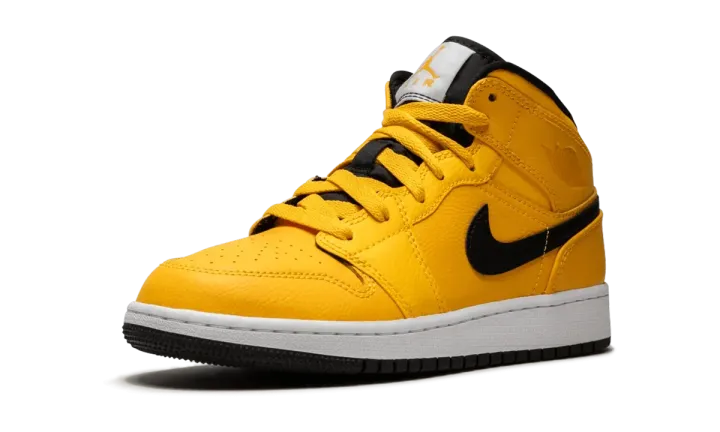 The Air Jordan 1 Mid GS "Taxi Yellow" is the grade school children's sizing for the eye-catching mid-top Jordan 1 colorway. Mirroring the adult version of the shoe, the Jordan 1 Mid is covered in a bright yellow leather upper with black accents on the side Swooshes, tongue, inner lining, and rubber outsole. White is found on the Jumpman tongue tag and midsole. The iconic "Wings" Air Jordan logo is embossed for a minimal appearance. The Air Jordan 1 Mid GS "Taxi Yellow" for kids released in the spring of 2019.
