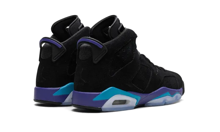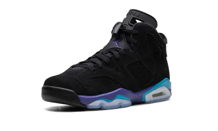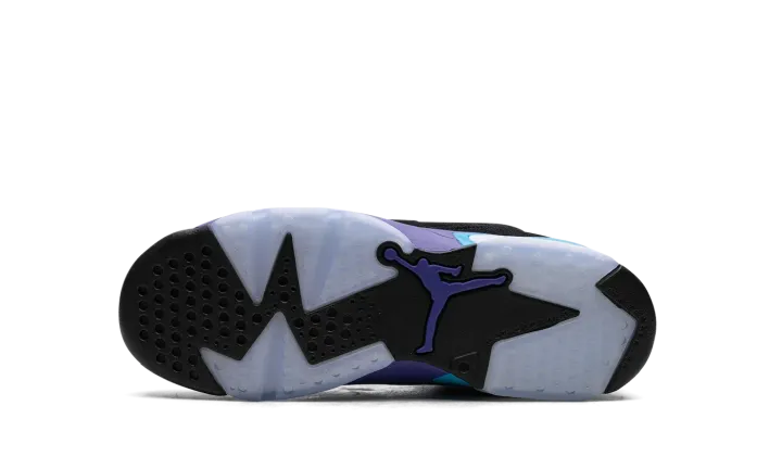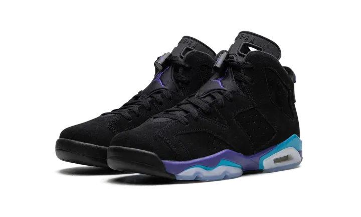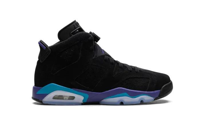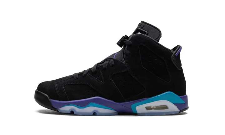 The Air Jordan 6 GS "Aqua" is the youth sizing of Michael Jordan's sixth signature shoe inspired by an iconic Air Jordan colorway. The shoe in question is the Air Jordan 8 "Aqua," an original colorway of the model that was worn by Jordan during the 1993 NBA All-Star Game. Jordan Brand transfers the Jordan 8 "Aqua's" color scheme onto the Jordan 6 by featuring the shoe's Bright Concord and Aquatone accents on the midsole. As for the rest of the shoe, the colorway features a black synthetic nubuck construction with tonal overlays. A Bright Concord Jumpman is embroidered on the tongue while a teal Jumpman is seen on the purple lace toggle. On the back of the shoe, a black spoiler with Aqua accents completes the design. Release date: October 7, 2023