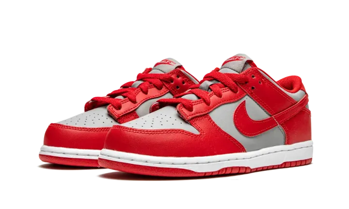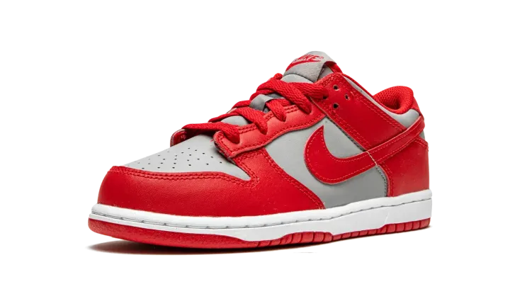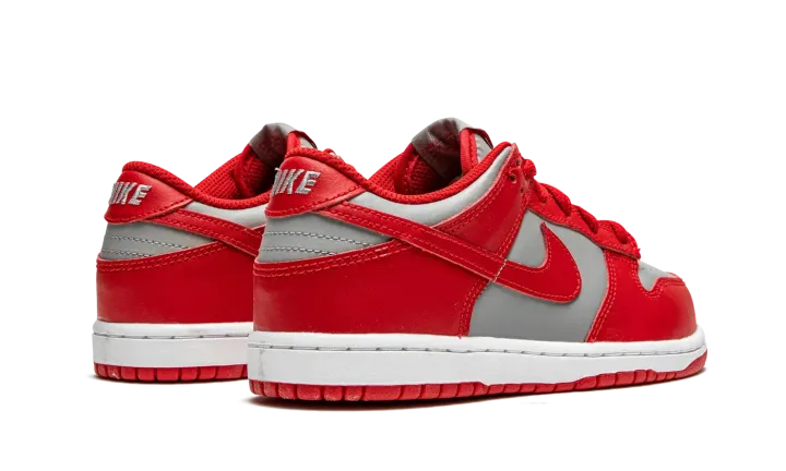 The Nike Dunk Low PS "UNLV" is the preschool sizing of an original colorway of the former performance basketball shoe that debuted in 1985 as part of the "Be True to Your School" pack. The "UNLV" Dunk was designed for the UNLV Runnin' Rebels basketball team during Nike's expansion into the college basketball ranks back in the mid-80s. In 2020 and 2021, Nike re-issued several iconic styles from the "Be True to Your School" collection, including the "Syracuse" and "Michigan" Dunks, in efforts to create excitement around the retro silhouette. To say Nike succeeded in doing so would be an understatement. Here, Varsity Red leather panels on the forefoot, eyelets, collar, and heel are laid over a Medium Grey leather base. A red leather Swoosh resides on either side and grey "Nike" embroidered is stitched onto the heel. Red "Nike" branding appears on the grey nylon tongue tag and a white midsole and red outsole are consistent with the original design of the Nike Dunk Low "UNLV."