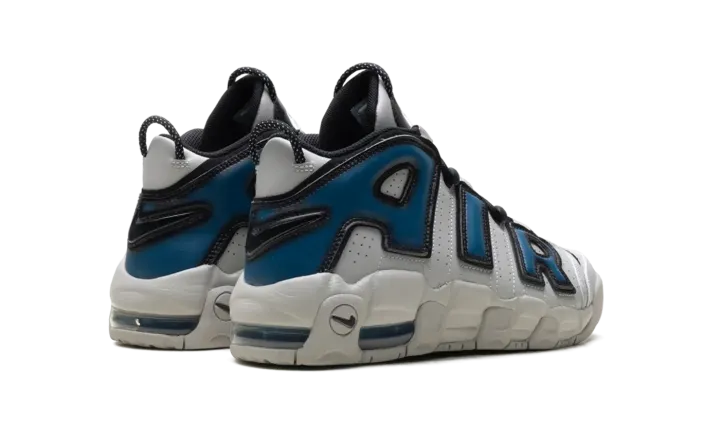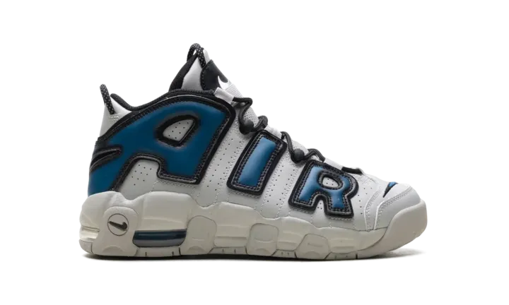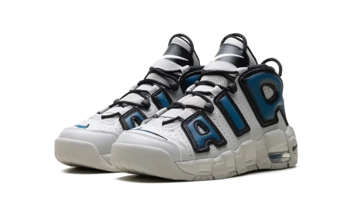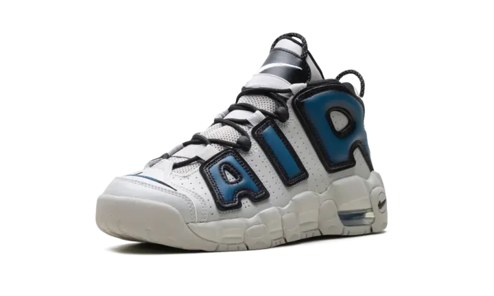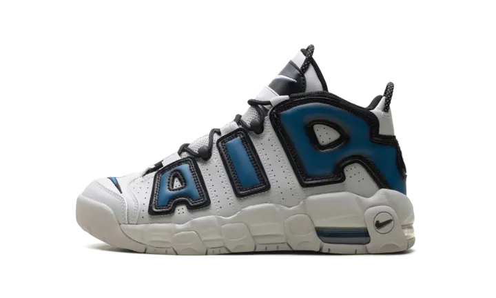 The Nike Air More Uptempo GS "Industrial Blue" is the youth sizing of the colorway of the retro basketball shoe with head-turning blue detailing. The Air More Uptempo was worn by Scottie Pippen with the Chicago Bulls in 1996. Today, the model is beloved for its '90s-inspired styling, ties to Pippen, and for its eye-catching colorways like the "Industrial Blue." The shoe has a White Bone leather upper with Industrial Blue leather "AIR" detailing on either side with an airbrush-like effect of black outlining. The blue hue also appears on the Swoosh on the toe and on the heel. An Air cushioning bubble in the heel completes the design. Release date: June 10, 2023