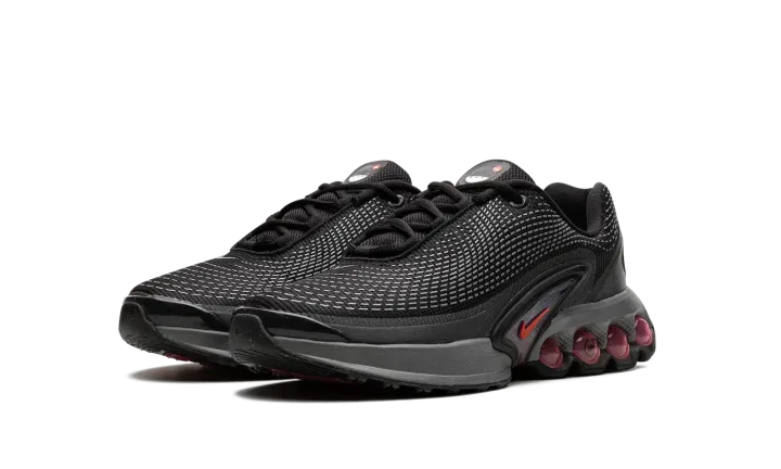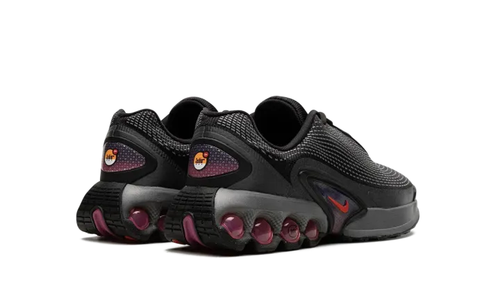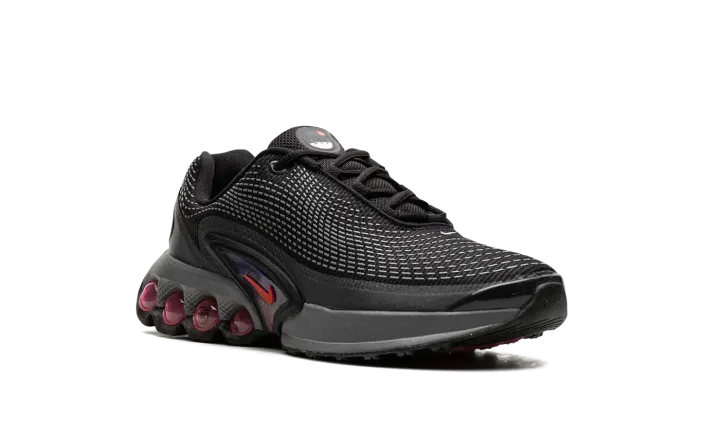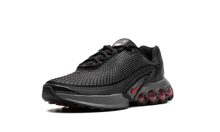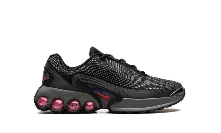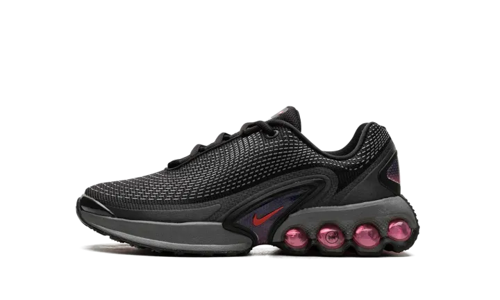 The Nike Air Max Dn GS "All Night" is the youth sizing of an original colorway of the shoe that debuted as part of Nike's Air Max Day in 2024. The Air Max Dn fuses classic Air Max design elements with modern sneaker design aesthetics. Specifically, the shoe is inspired by the Nike Air Max Plus, otherwise known as the Air Max TN (Tuned Air.) On the "All Night" colorway, the upper features a black mesh construction with a tonal fused overlay. A classic Swoosh logo appears on the sides of the shoe. Underfoot, four oversized circular pods in a Light Crimson hue are found on the heel of the midsole. Release date: March 26, 2024