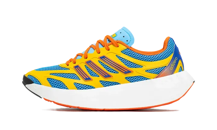 The Adidas Adizero ARUKU "Sky Blue/Orange" is a running sneaker designed for men, focusing on lightweight performance, consistent with the Adizero line. The shoe features a vibrant color palette with a "Sky Blue" upper, likely constructed from a breathable, lightweight mesh. This is complemented by striking "Orange" accents, possibly on the Three Stripes branding, laces, and sole elements, offering a high-visibility, energetic look. The Adizero designation indicates it is built for speed and efficiency.