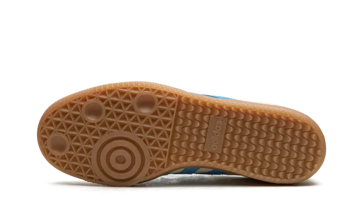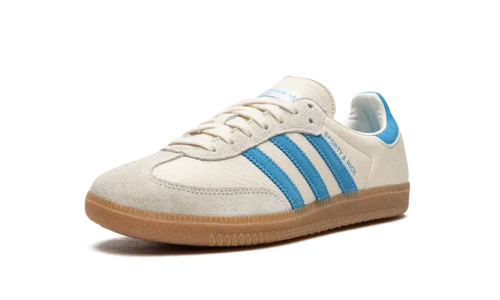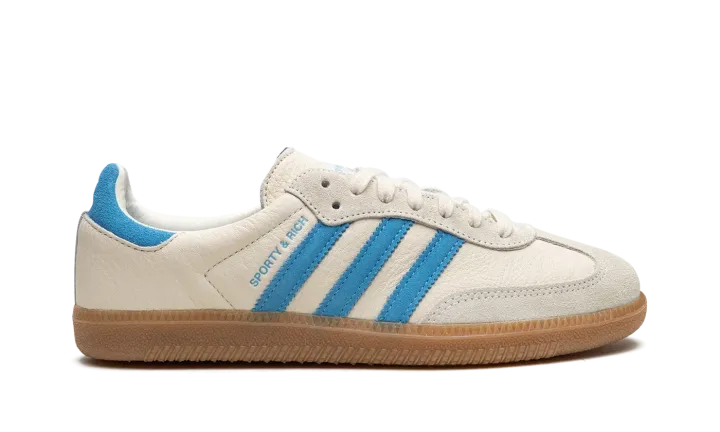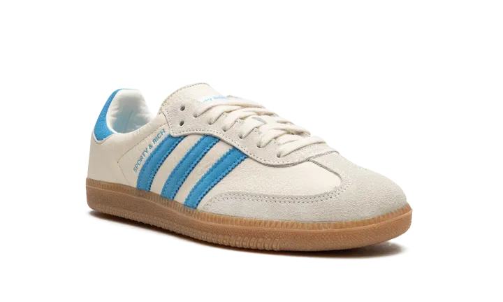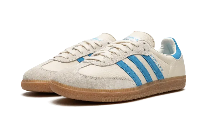 The Sporty and Rich x Women's adidas Samba "Cream/Blue" is a women's-exclusive colorway of the popular retro indoor soccer model from the collaboration by Emily Oberg's sportswear brand. The Sporty and Rich Samba features a cream leather construction with a tonal suede toe overlay. A blue suede Three Stripes logo is found on the sides next to a blue "Sporty and Rich" logo. Dual "adidas" and "Sporty and Rich" detailing appears on the heel tab. Classic adidas Samba branding is located on the tongue. A gum rubber sole completes the clean design. Release date: May 4, 2023