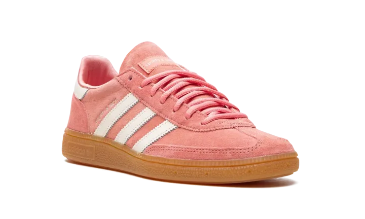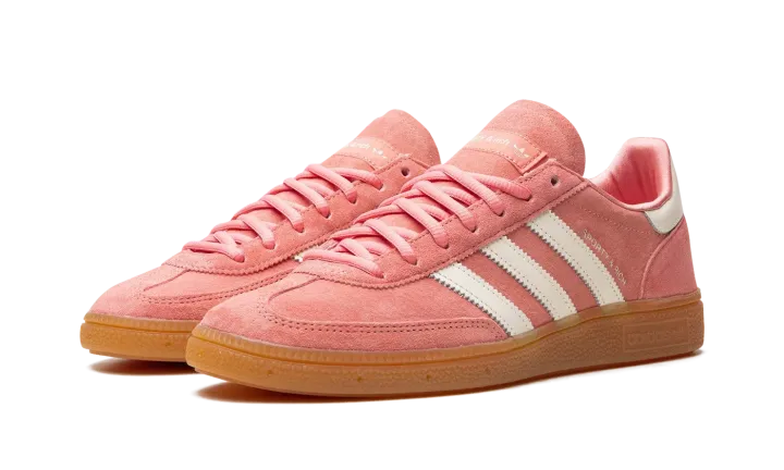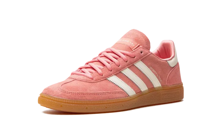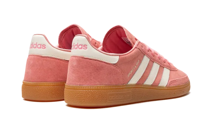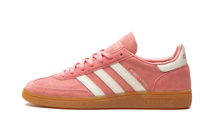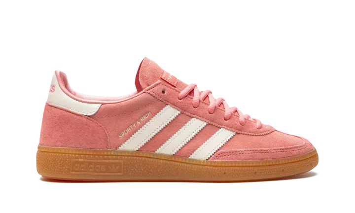 The Sporty & Rich x adidas Handball Spezial "Pink/White" is a collaboration by Emily Oberg's sportswear brand and adidas on a colorway of the classic sneaker. One of several adidas Handball Spezial collaborations by Sporty & Rich, the "Pink/White" features a Panton or Pink suede construction with white leather Three Stripes branding on the sides. A white "Sporty and Rich" logo is located on the lateral side of the midfoot. Dual "adidas" and "Sporty and Rich" detailing is found on the tongue, while a pink "adidas" logo appears on the white leather heel tab. Underfoot, a classic-looking gum rubber sole completes the look.