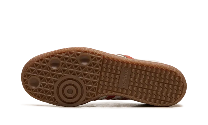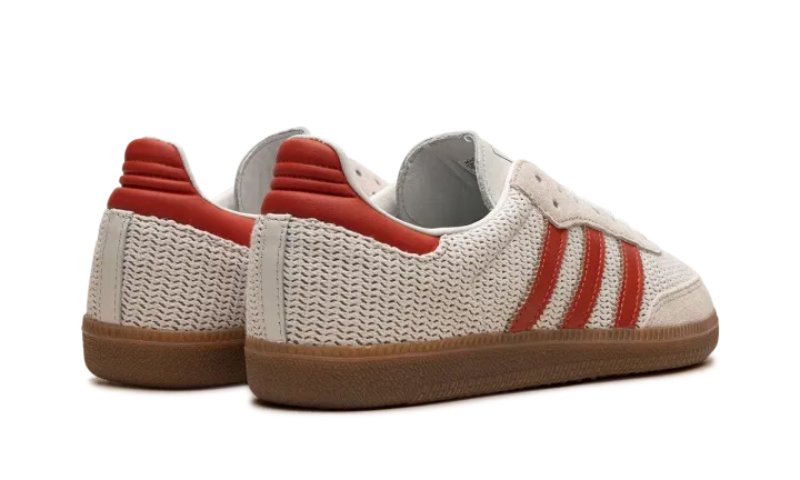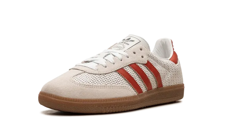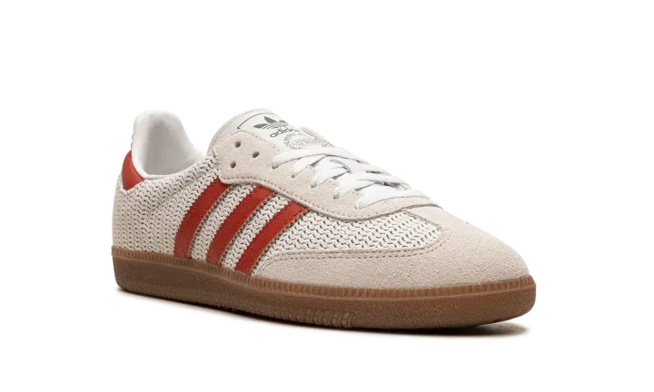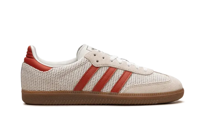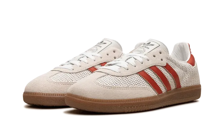 The adidas Samba OG "Preloved Red" is a colorway of the popular style with an airy, breathable mesh construction. The "Preloved Red" features an off-white open-mesh upper with tonal suede overlays on the toe and eyelets. The Three Stripes branding on the sides are designed in Preloved Red leather, matching the color of the heel tab. An "adidas" logo can be found on the tongue. A classic Gum rubber sole completes the look. Release date: April 1, 2024