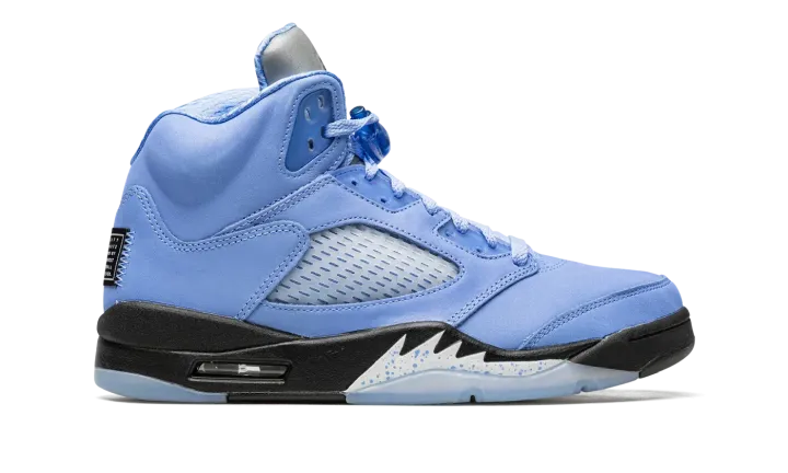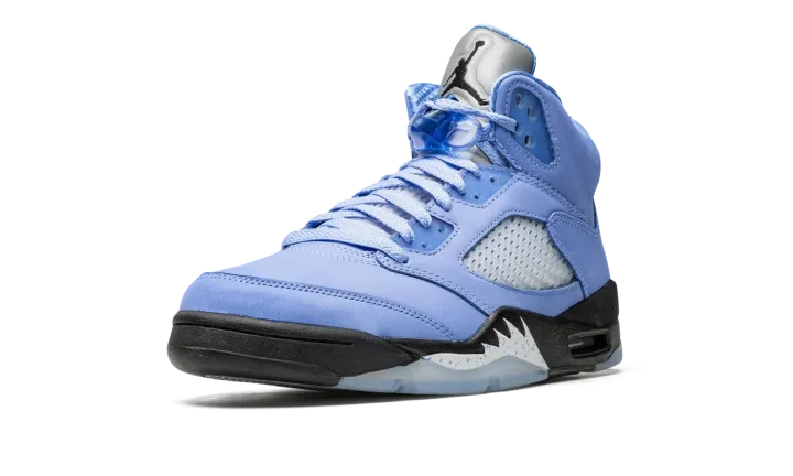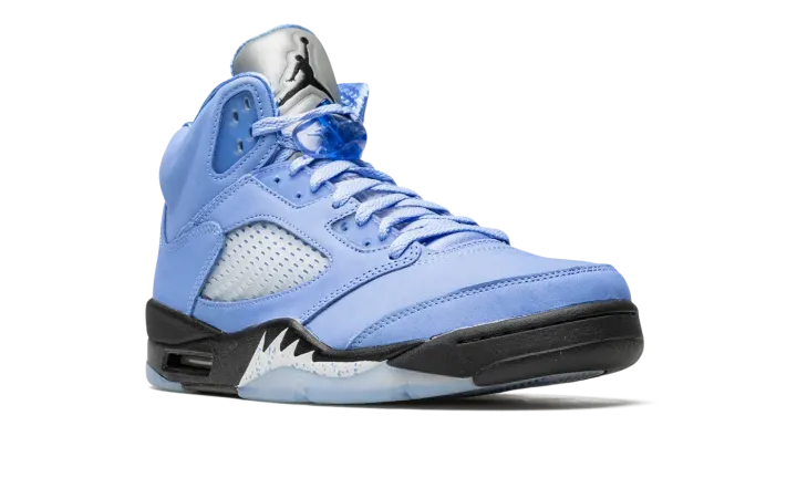 The Air Jordan 5 "UNC" is a colorway of the retro basketball shoe in a colorway inspired by Michael Jordan's alma mater, the University of North Carolina. The "UNC" Jordan 5 is not affiliated with the UNC Tar Heels, but nonetheless draws inspiration from the school and its college basketball team. The upper is designed in a University Blue nubuck construction with translucent netting on the tongue and mid-panel. A Jumpman is embroidered on the reflective Metallic Silver tongue. The heel is updated with a Team Jordan patch stitched on each shoe, while the model's signature icy clear outsole is paired with a black midsole that features silver shark tooth detailing. Release date: March 4, 2023