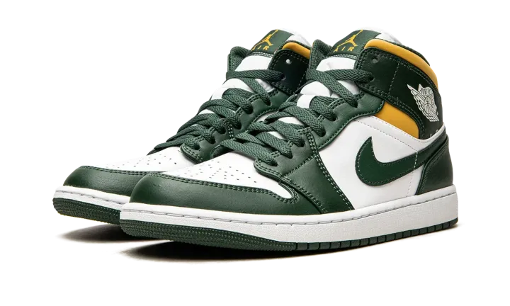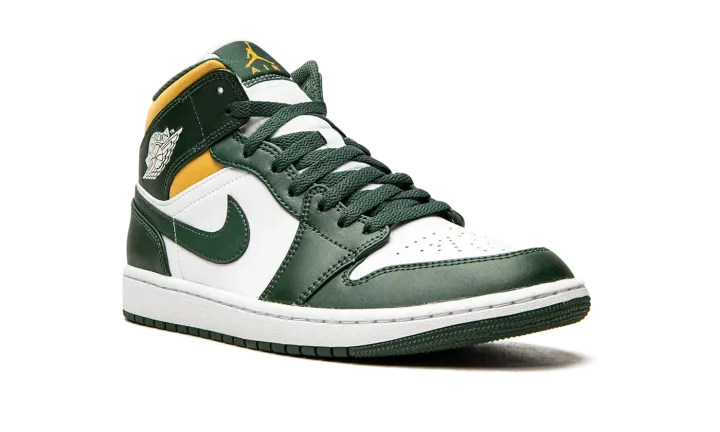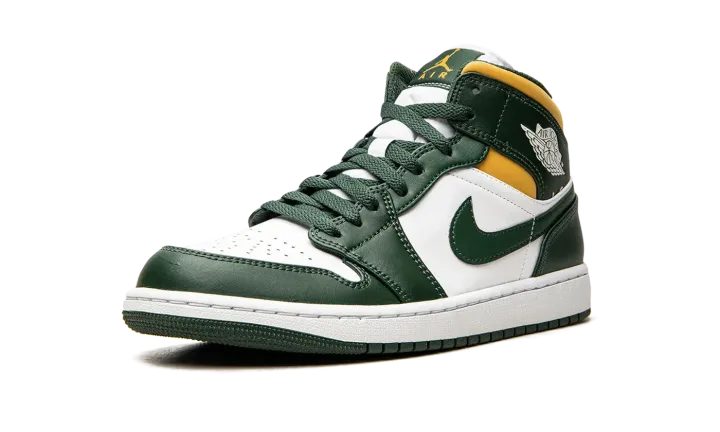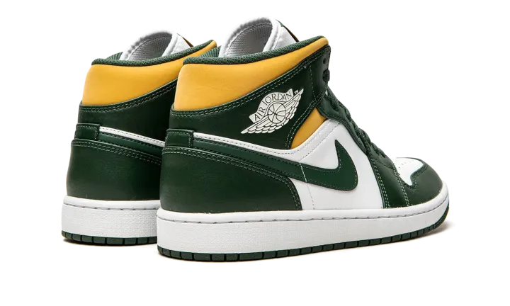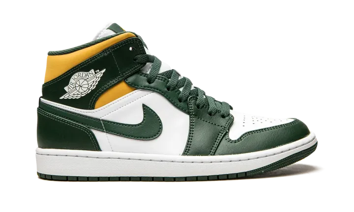 The Air Jordan 1 Mid "Sonics" is a colorway of Michael Jordan's first signature shoe in the mid-top silhouette that features the former team uniform colors of the Seattle Supersonics. The now-defunct Sonics, who relocated to become the Oklahoma City Thunder in the late 2000s, wore green-and-yellow team uniforms and were among the most popular basketball teams in the NBA back in the day. The "Sonics" Jordan 1 Mid unofficially honors the team with Noble Green leather overlays against a white leather base. A green leather Swoosh resides on either side of the shoe. A white "Wings" logo is found on the collar and white Jumpman and "Air" detailing appears on the green leather tongue tag. A Pollen-colored collar adds to the Sonic-inspired look.