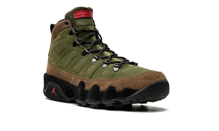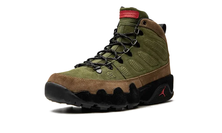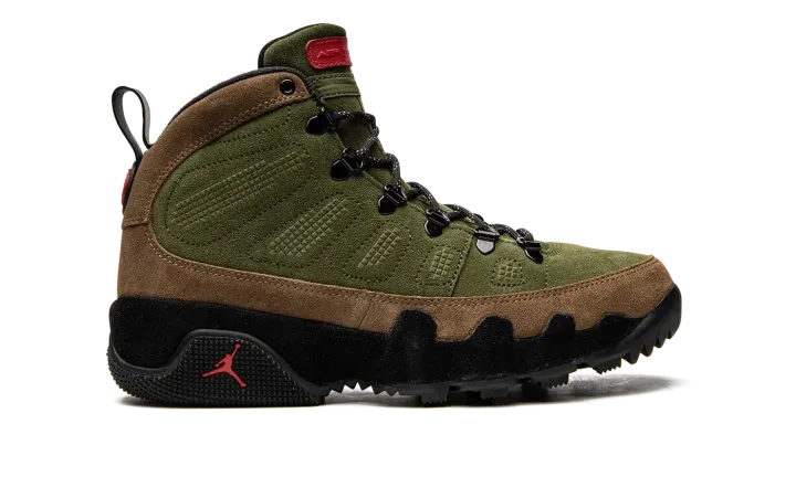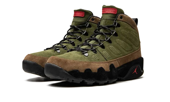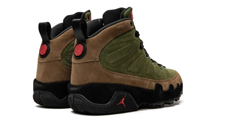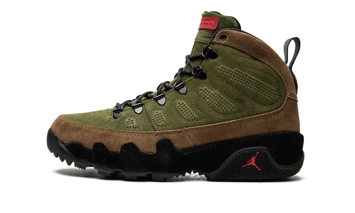 The Air Jordan 9 Retro Boot "Beef and Broccoli" is an alternate version of Michael Jordan's ninth signature shoe reimagined as a winter boot. The Jordan 9 Boot features a rugged look and feel made to withstand the elements. The "Beef and Broccoli" colorway references a classic Timberland boot colorway. The shoe is complete with an olive suede upper with brown suede overlays. A water-resistant coating provides protection against wet weather. Rugged, boot-like details include rope laces and metal eyelets, and a lugged black rubber outsole. Release date: December 1, 2018