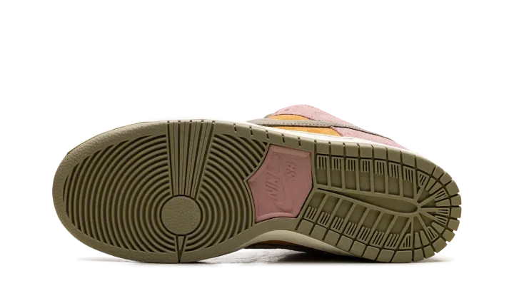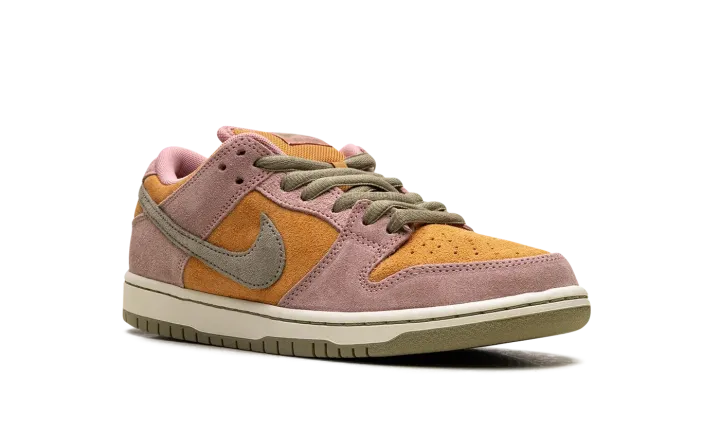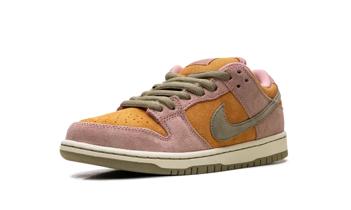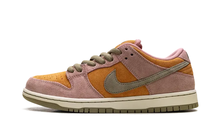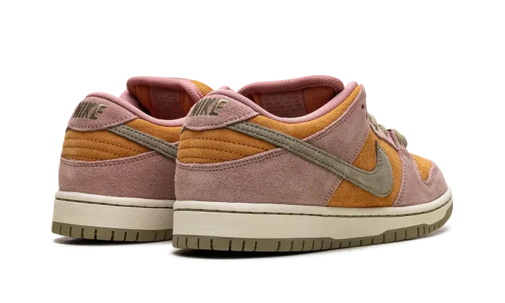 The Nike Dunk Low SB 'Red Stardust' (HJ4135 600) has a muted orange suede upper with contrasting pink overlays and a light olive Swoosh. The Nike SB logo decorates the tongue tag and insoles, equipped with a Zoom Air heel unit.
