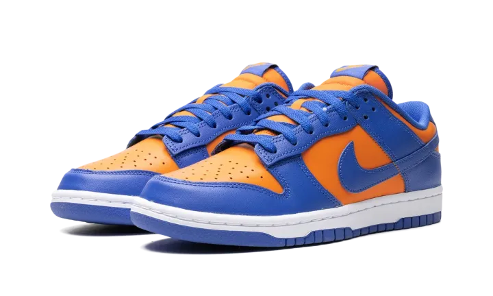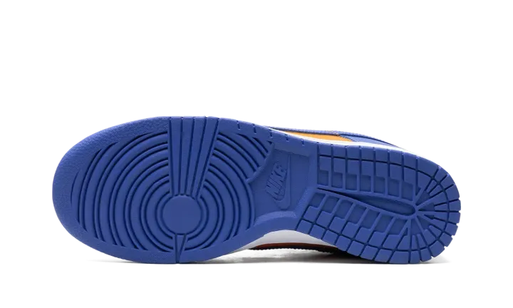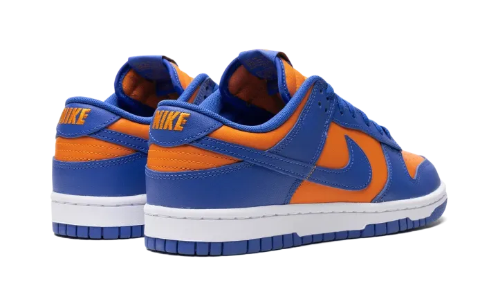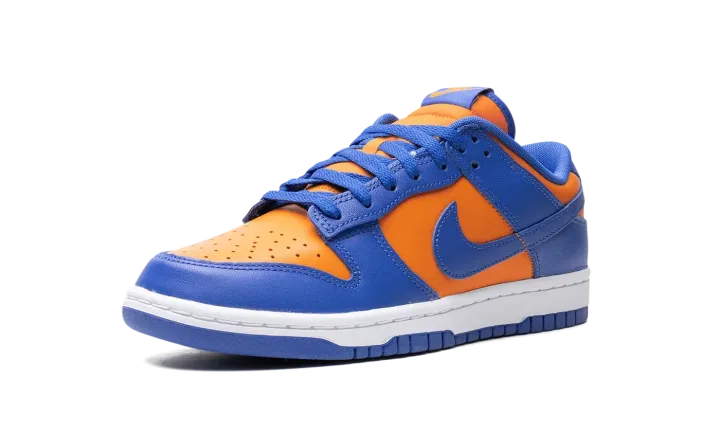 The Nike Dunk Low "Knicks" is a colorway of the retro basketball shoe in the colors of the New York Knicks. While not associated with the Knicks, the Dunk Low named after the NBA team nonetheless shows love to the squad with its orange-and-blue appearance, matching the colors found on the Knicks' team uniforms. The upper has an orange leather base and blue leather overlays and Swoosh branding. "Nike" branding is embroidered on the heel, and "Nike" and Swoosh logos appear on the tongue. A white midsole and blue outsole complete the look.