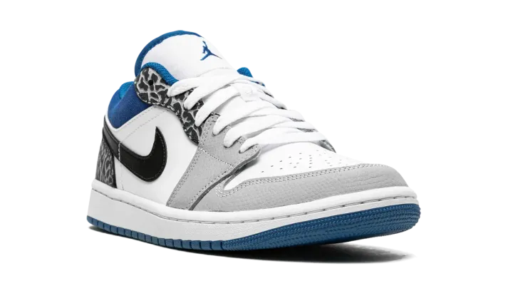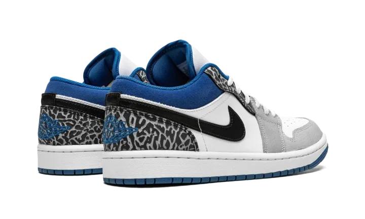 The Air Jordan 1 Low SE "True Blue" is a colorway of Michael Jordan's first signature shoe that pays homage to the original Air Jordan 3 theme of the same name. A June 2022 release by Jordan Brand, the "True Blue" Jordan 1 Low SE features design elements and colors lifted from the Jordan 3 "True Blue" that was originally released in 1988. The perforated toe and mid-panel are designed in white leather. Contrasting light grey leather appears on the toe cap and forefoot. Classic elephant patterning is found on the upper eyelet panel and on the heel with blue "Wings" embroidery. A black leather Swoosh resides on the sides. A Dark Marina Blue Jumpman logo appears on the white leather tongue. Additional blue accenting comes into play on the suede collar and on the underside of the tongue. Release date: June 11, 2022