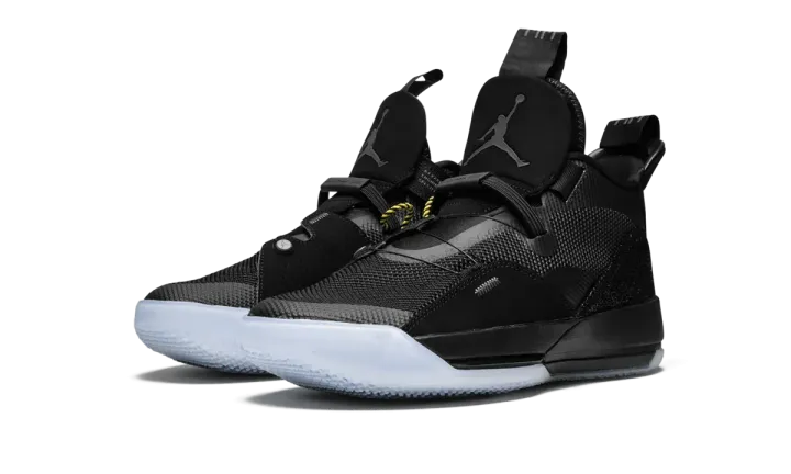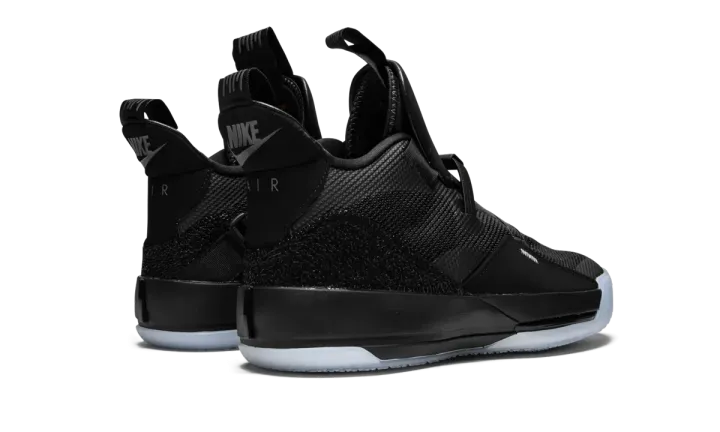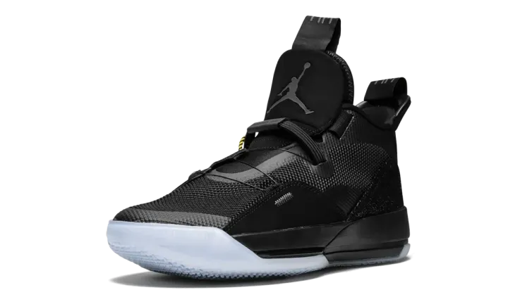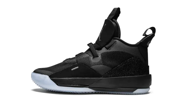 The Air Jordan 33 "Utility Blackout" is a performance basketball shoe that brings the future of flight to your feet. With an almost entirely black upper, the sneaker looks stealth. Its icy translucent outsole unit supports the shoe and a subtle elephant print covers the heel area. A Jumpman logo rests on the exposed tongue and a throwback Nike Air stamps the heel. With upgraded Flight Speed technology, a FastFit tightening system with an innovative pull cord, the Air Jordan 33 "Utility Blackout" provides a superior fit.