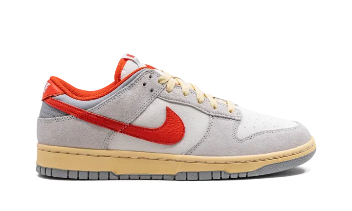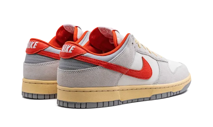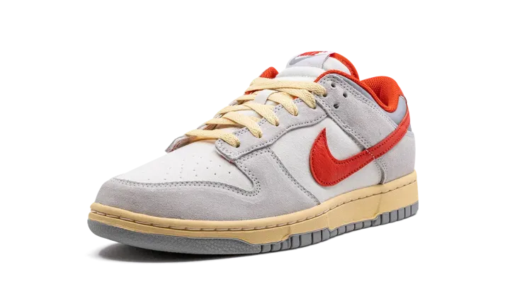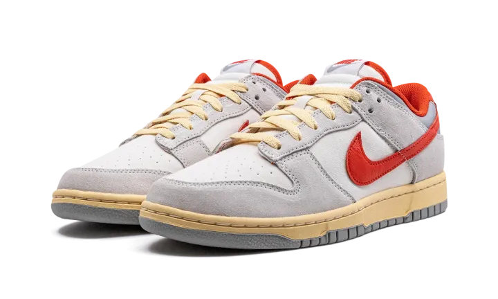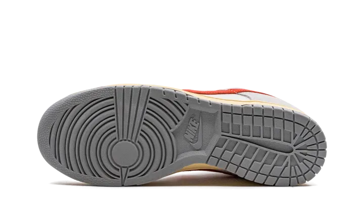 The Nike Dunk Low "Athletic Department - Grey/Red" is a colorway of the retro basketball shoe with an old-school-inspired appearance. From Nike's "Athletic Department" collection, which includes other classic sneakers, the "Grey/Red" features a light grey fabric base with tonal suede overlays throughout the design. A red leather Swoosh appears on the sides. The fiery red hue is also found on the leather heel tab with "Nike" branding. A red "Nike" logo is paired with a grey Swoosh on the tongue tag.