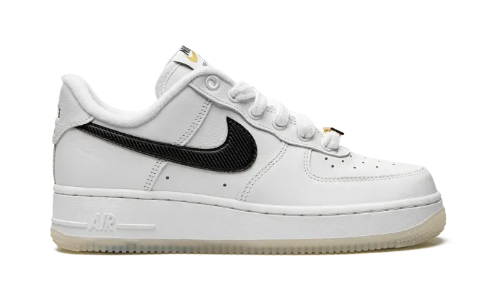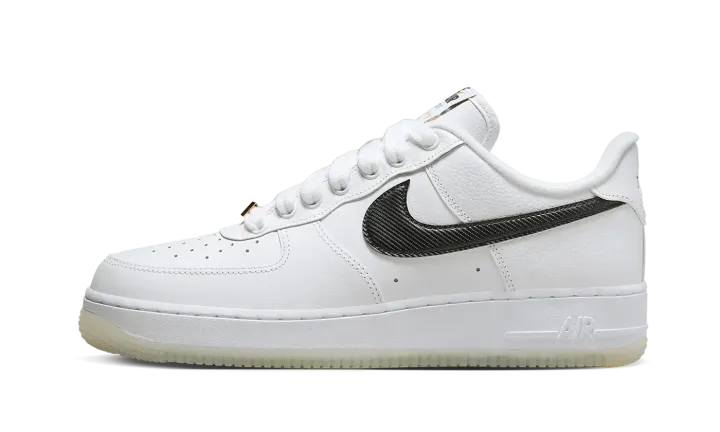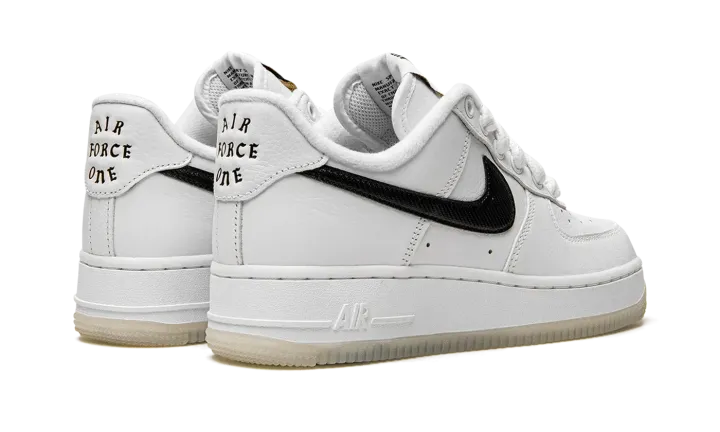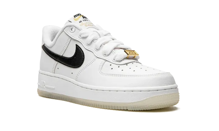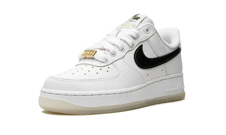The Nike Air Force 1 Low "Bronx Origins" is a colorway of the classic sneaker that pays tribute to the Bronx's hip-hop legacy. Nike celebrated the Air Force 1's 40th anniversary in 2022 by releasing the iconic silhouette in colorways dedicated to the shoe's standing in various cultures, like the "Bronx Origins." The shoe features a white leather build with black leather Swooshes on either side. Modified "Air Force One" branding is found on the heel. The shoe's gold lace dubraes read "1973" on the left shoe and "1982" on the right, respectively. The dates nod to the years hip-hop and the Air Force 1 were created in. Special "Nike Air Force 1 Anniversary Edition" insignia appears on the tongue tag. Release date: October 14, 2022