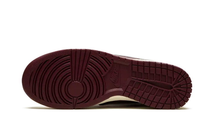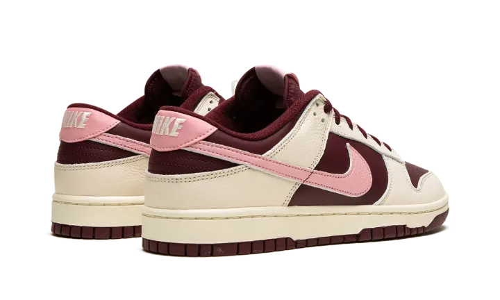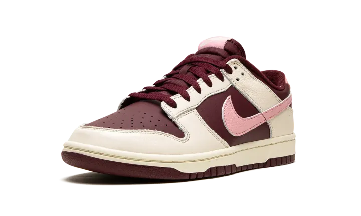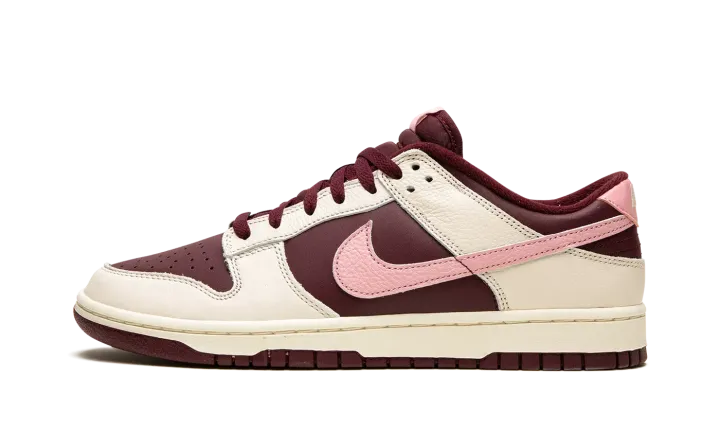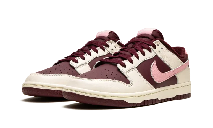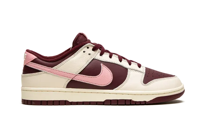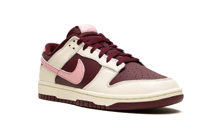 The Nike Dunk Low Premium "Valentine's Day 2023" is a festive colorway of the retro basketball shoe that celebrates the Lover's Holiday. The "Valentine's Day" Dunk Low is the 2023 version of the popular theme that shows love, no pun intended, to Valentine's Day. This time around, the shoe features a two-tone, maroon and Pale Ivory color combination. Specifically, maroon leather appears on the base while Pale Ivory leather overlays. A pink tumbled leather Swoosh is found on either side of the shoe. Classic "Nike" branding is embroidered on the heel and "Nike Dunk" detailing is found on the tongue tag. The cream rubber midsole gives the shoe a decidedly aged, vintage look. Release date: February 7, 2023