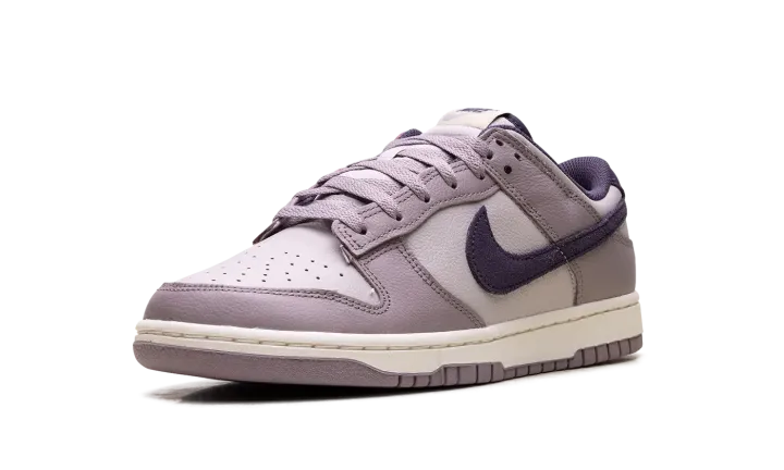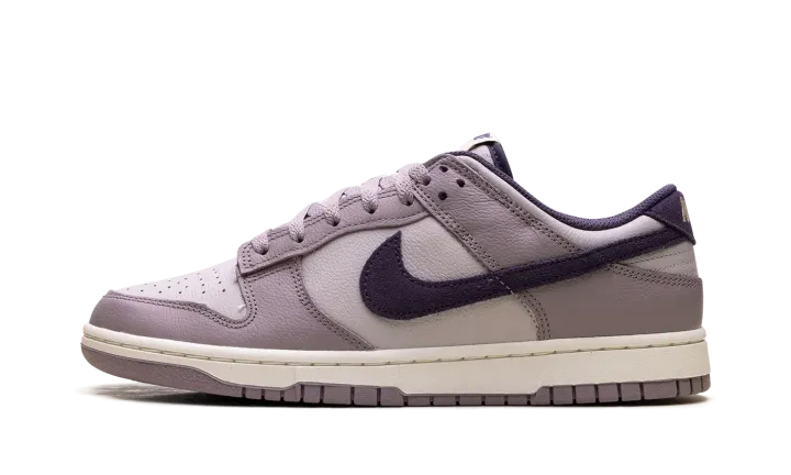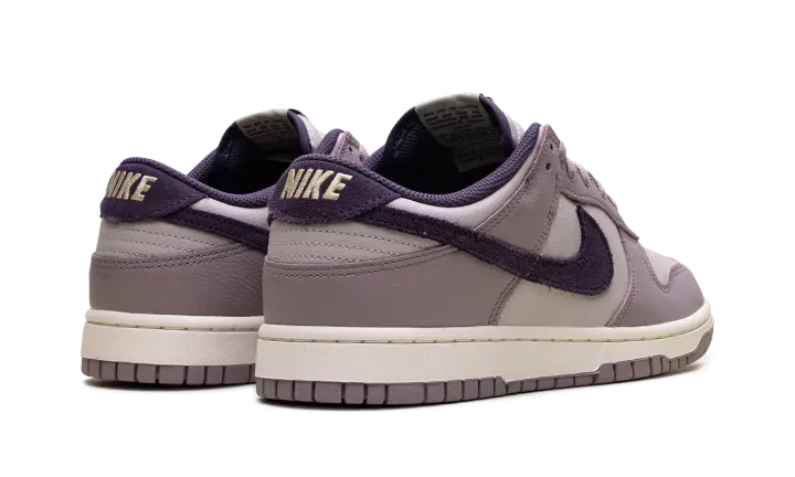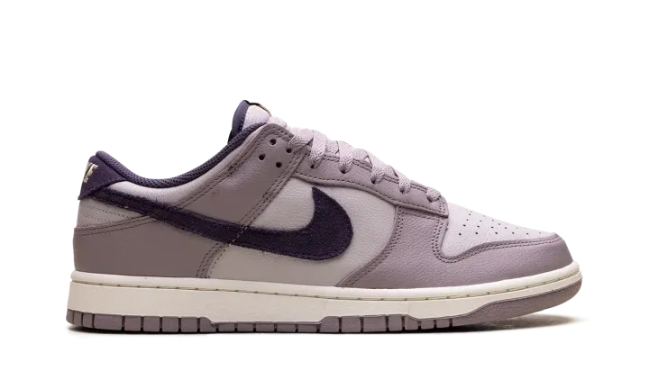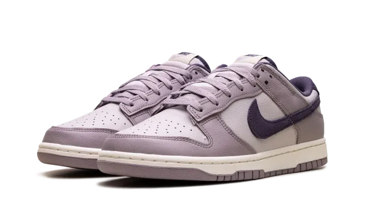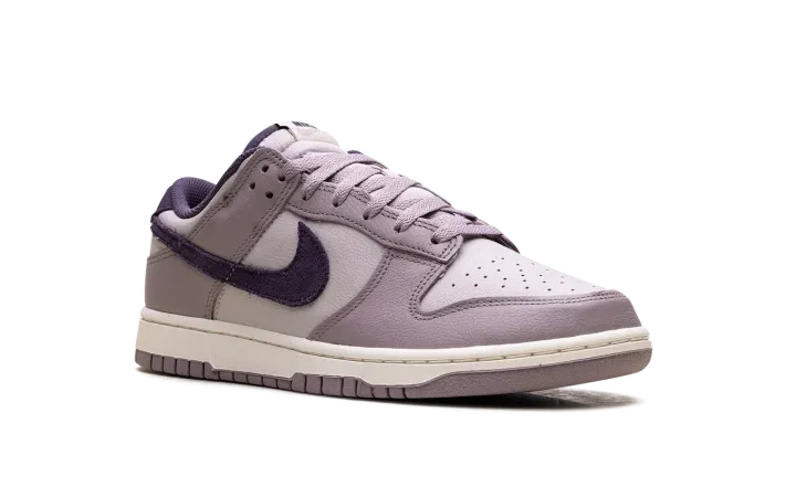 Made with tumbled leather, the Nike Dunk Low SE 'Light Violet Ore' sports two shades of lavender with dark violet, decorating the collar lining, suede back tab and the Swoosh on the side.