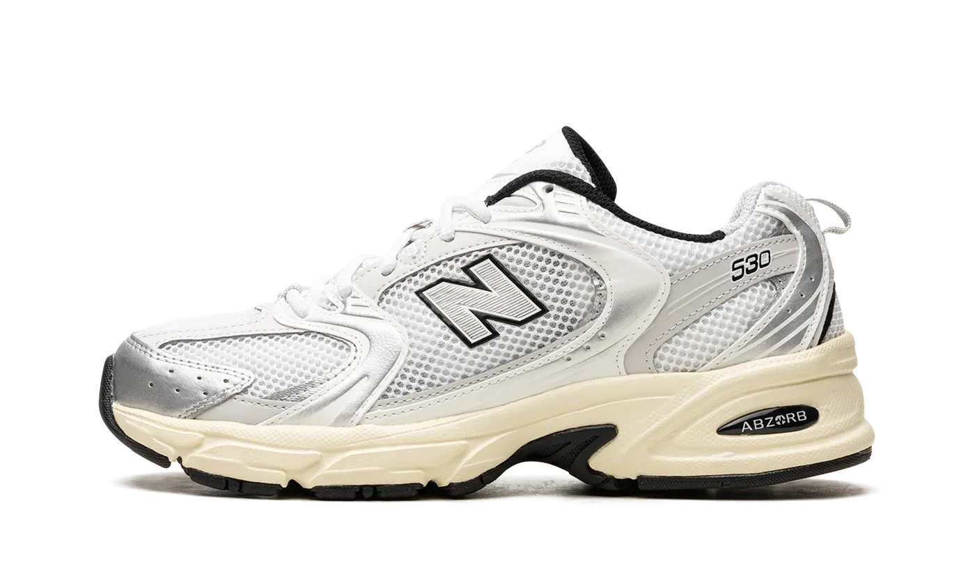 The New Balance 530 "White/Silver" is a classic-looking colorway of the retro running and lifestyle shoe by the Boston footwear company. The 530 was originally released in 1992 as a running sneaker and, in the years since its debut in the performance footwear category, has transitioned into a lifestyle shoe. As for its design, the colorway has a white open mesh construction with white and silver leather overlays. A silver "N" logo appears on the sides. A "530" logo is seen on the lateral side of the collar. Classic "NB" branding is located on the tongue. Underfoot, New Balance supplies the chunky, vintage-looking foam midsole with its signature ABZORB cushioning.