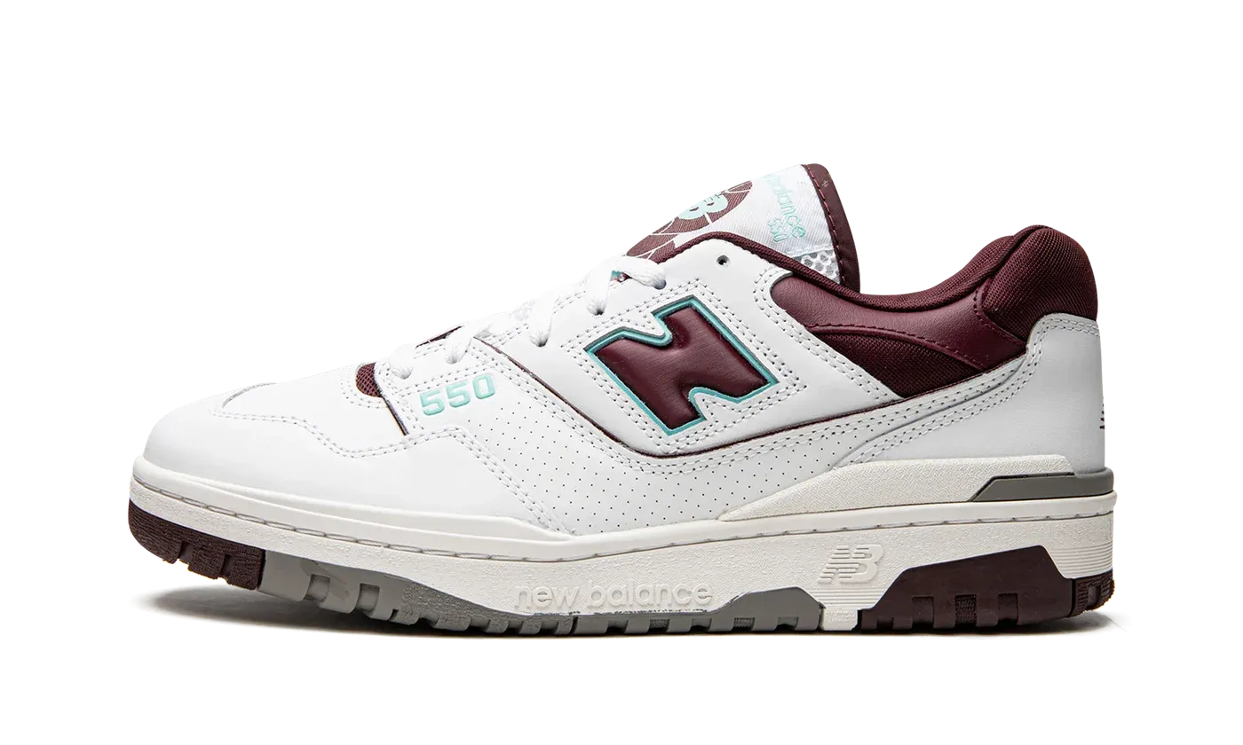 The New Balance 550 "Burgundy/Cyan" is yet another popular colorway of the vintage basketball and lifestyle shoe that returned in a big way in 2020. The 550 was unearthed by Aime Leon Dore, the New York based clothing brand, back in 2020, and has since become one of New Balance's most desirable sneakers, and for good reason. The 550's throwback design is timeless in every way possible. Here, the "Burgundy/Cyan" features a white perforated leather construction. A contrasting burgundy leather overlay appears on the burgundy nylon collar. Additional burgundy accenting comes into play on the "N" branding with Cyan-colored trim on the sides and the "New Balance 550" details on the tongue. A Cyan "550" logo is embroidered on the forefoot. Release date: January 8, 2022