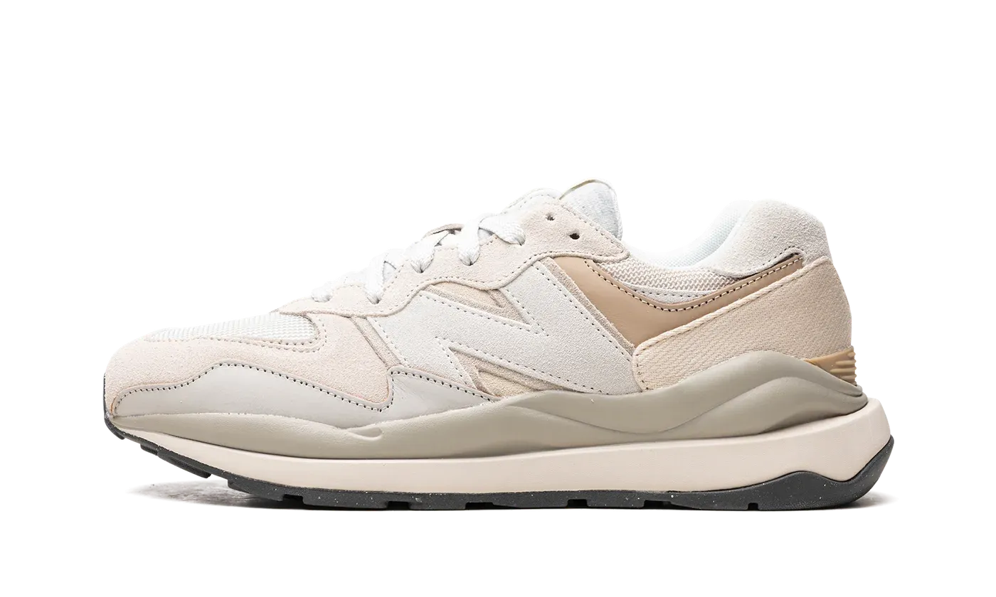 The New Balance 57/40 "Moonbeam" is a versatile, neutral-based colorway of the sneaker with a retro-modern look. Originally released in 2020, the New Balance 57/40 updates the popular and classic New Balance 574 with a contemporary design. The "Moonbeam" features a white mesh toe with beige suede overlays on the toe cap, forefoot, and eyelets. An oversized white suede "N" logo appears on the side. "NB" and "57/40" detailing are seen on the white nylon tongue tag. A chunky, retro-inspired cream foam midsole gives the shoe a vintage performance running shoe look. Release date: May 21, 2022