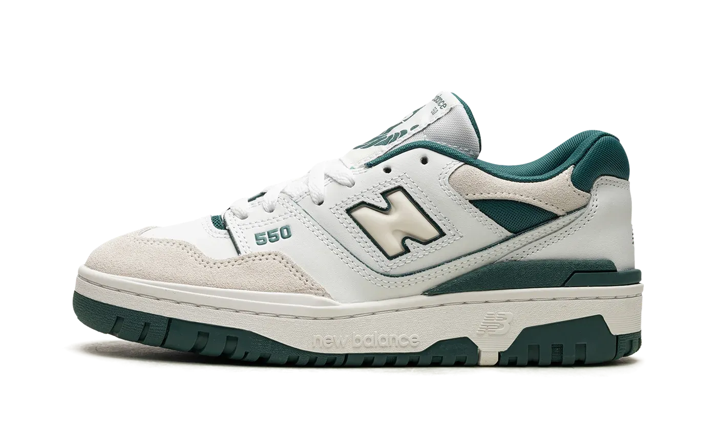 The New Balance 550 GS "Vintage Teal" is the youth sizing for the colorway of the retro basketball sneaker with a summer look. The "Vintage Teal" features a look that's perfect for warm weather wear. White leather appears on the shoe's upper while a light grey suede overlay is seen on the toe. A milky white "N" logo with Vintage Teal trim appears on the side. More Vintage Teal accenting is seen on the "550" branding on the lateral side of the forefoot, the "NB" logo on the heel, and the "New Balance 550" graphic on the tongue tag. Both the mesh collar and inner lining are also finished in Vintage Teal. Underfoot, the chunky white rubber midsole is matched with a teal rubber outsole. Release date: June 21, 2023