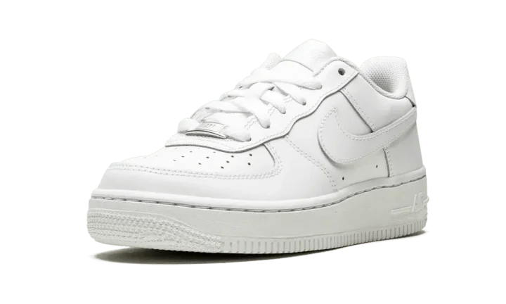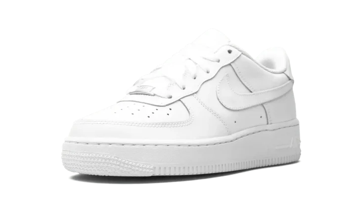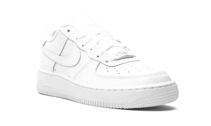 The Nike Air Force 1 Low GS "White on White" is the youth sizing of one of the most essential sneakers in the history of footwear. Nicknamed the "Uptown" for its iconic status in New York City's Harlem neighborhood, the Air Force 1 Low "White on White" is a go-to for those seeking a reliable pair of shoes that never goes out of style. Here, the upper features white leather on the perforated toe, mid-panel, and heel. Tonal overlays appear on the forefoot and heel. Classic Swoosh detailing covers the mid-panel while a tonal nylon "Nike Air" branding patch dots the tongue. White embroidered "Nike Air" branding is located on the heel and a white-on-white sole with tonal "Air" insignia on the heel finishes off the look.