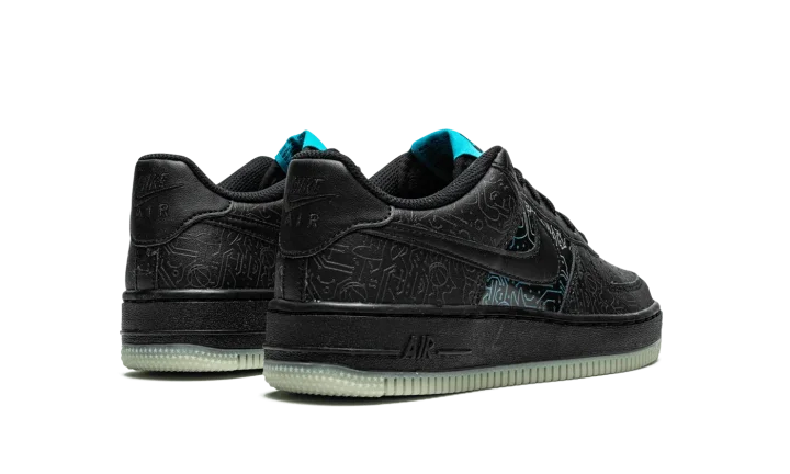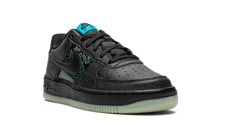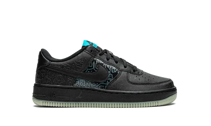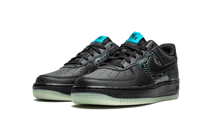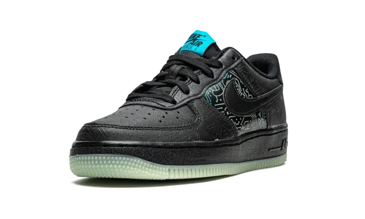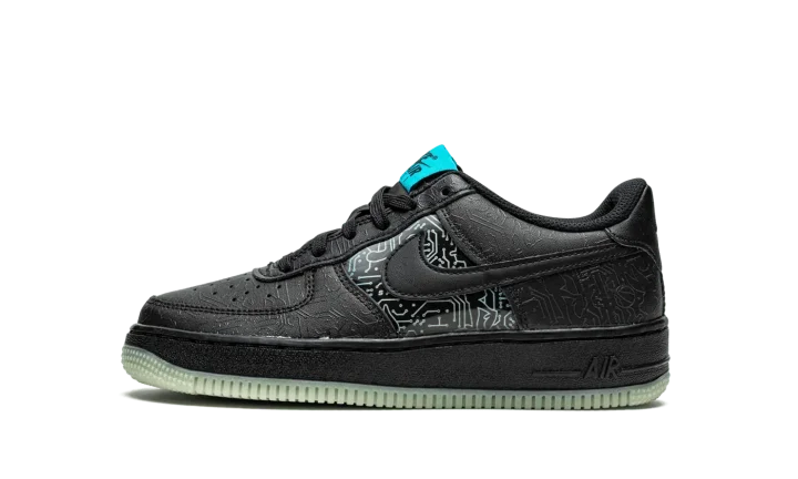 The Space Jam x Nike Air Force 1 Low GS "Computer Chip" is the youth sizing of the special edition colorway of the vintage basketball that salutes the "Space Jam 2" film franchise. Futuristic, computer chip-style graphics printed onto the panels of the black leather upper are the highlight of this design, one of several "Space Jam 2" themed sneaker releases by Nike in July 2021. When looked at closely, the lines and shapes of the graphics resemble the silhouettes of various "Space Jam 2" characters. The lines appear in a tonal hue on the perforated toe, forefoot, eyelets, collar, and heel and blue on the mid-panel. A black leather Swoosh breaks up the look on both sides and a blue "Nike Air Force 1" tongue tag resides on the black nylon tongue. A glow-in-the-dark sole unit completes the look. Release date: July 16, 2021