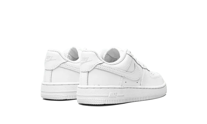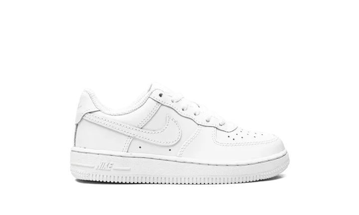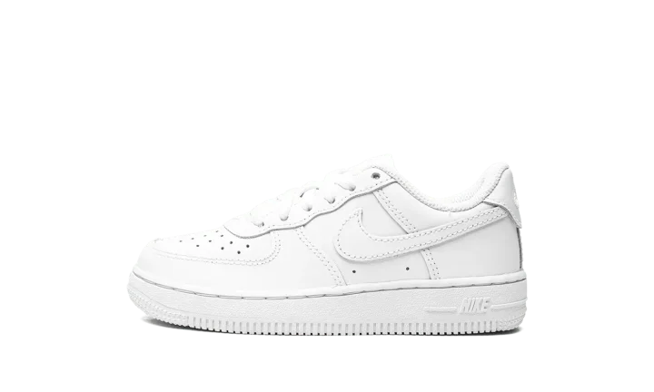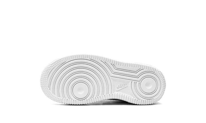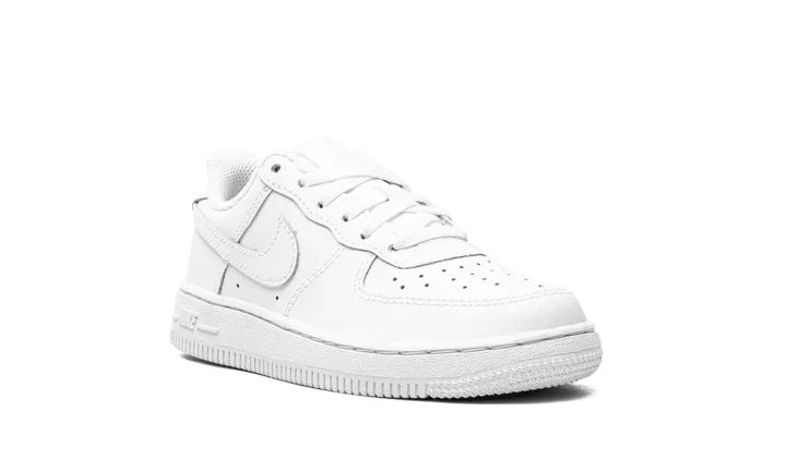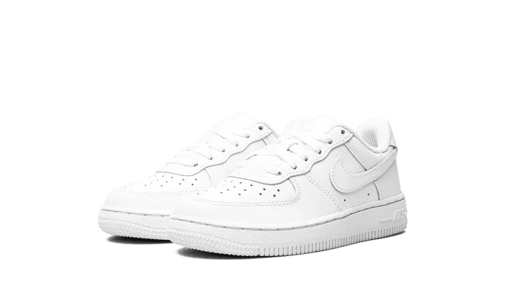 The Nike Air Force 1 Low PS "White on White" is the preschool version of the monochromatic white colorway of the low-top lifestyle shoe. One of the most popular shoes offered by Nike, the Air Force 1 is a vintage basketball sneaker that debuted in the 1980s and has since become an everyday casual staple. The entire upper is covered in white leather, including the perforated toe, mid-panel, heel, and Swoosh. The overlaid panels also appear in white leather. Dual "Nike" and Swoosh branding can be found on the heel. Additional "Air Force" detailing graces the white nylon tongue tag. A chunky white rubber midsole with tonal "Nike" on the heel completes the look.