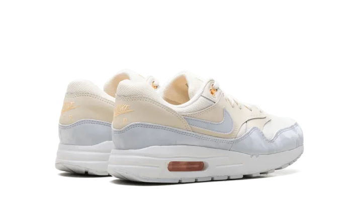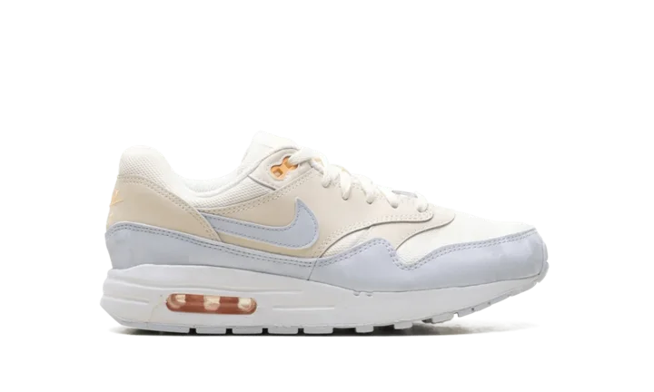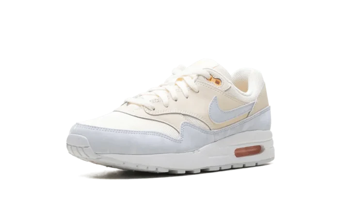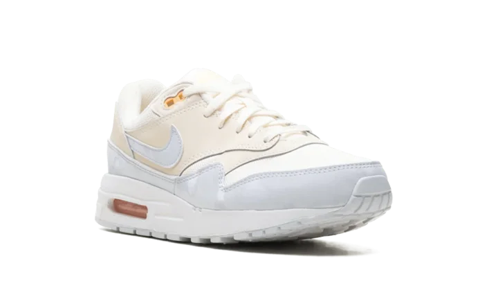 The Nike Air Max 1 GS "Pale Ivory/Football Grey" is a kids version of the retro running shoe with an easy-on-the-eyes appearance. The upper features a Pale Ivory mesh base with tonal leather overlays on the toe and mid-panel. A Football Grey leather Swoosh appears on either side of the shoe, matching the hue of the leather mudguard. "Nike Air" branding is embroidered on the heel and an orange "Nike" logo is paired with a Swoosh on the tongue tag. A visible Air unit in the heel of the white foam midsole completes the look. Release date: September 26, 2023