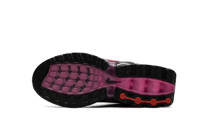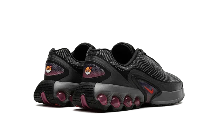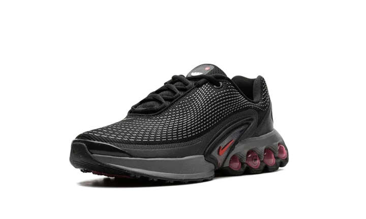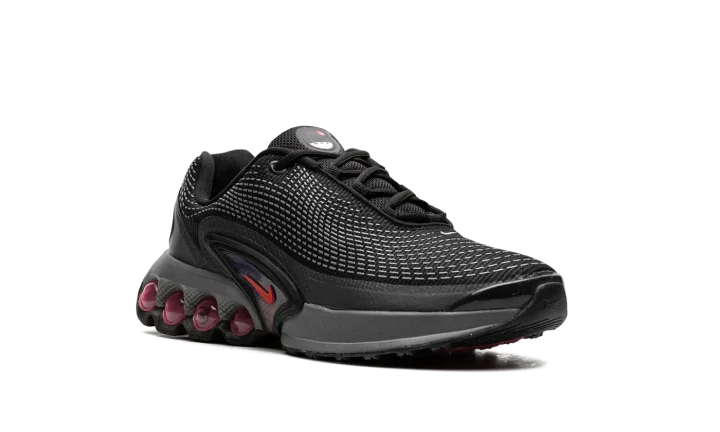 The Nike Air Max Dn GS "All Night" is the youth sizing of an original colorway of the shoe that debuted as part of Nike's Air Max Day in 2024. The Air Max Dn fuses classic Air Max design elements with modern sneaker design aesthetics. Specifically, the shoe is inspired by the Nike Air Max Plus, otherwise known as the Air Max TN (Tuned Air.) On the "All Night" colorway, the upper features a black mesh construction with a tonal fused overlay. A classic Swoosh logo appears on the sides of the shoe. Underfoot, four oversized circular pods in a Light Crimson hue are found on the heel of the midsole. Release date: March 26, 2024