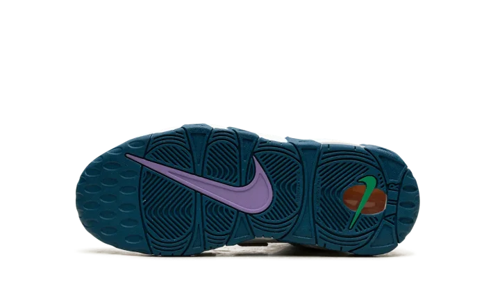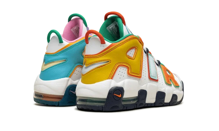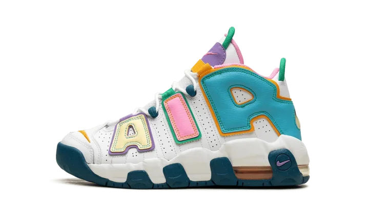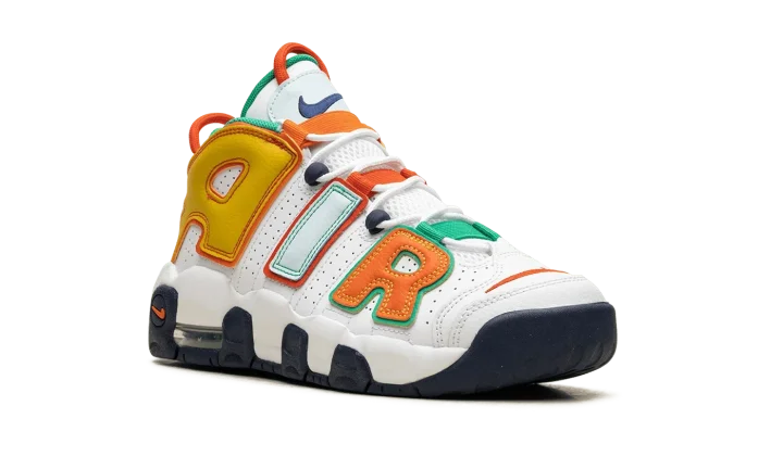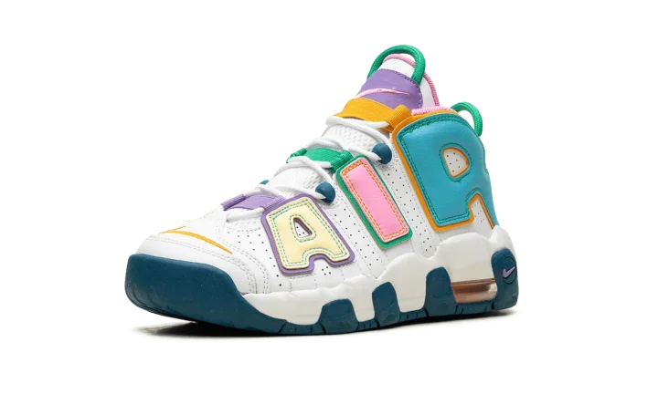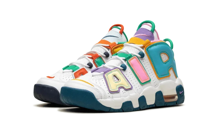The Nike Air More Uptempo GS "What The" is the youth sizing of retro basketball shoe in the popular, eye-catching colorway theme. The "What The" color story has since appeared on several classic Nike models, including Scottie Pippen's signature shoe, the Air More Uptempo. As for the design more specifically, the upper features a white leather construction with multi-colored "AIR" branding on either side. Mismatched Swooshes are found on the toe while a jeweled Swoosh can be seen on the heel. Underfoot, mismatched rubber outsole colors contrast the white midsole. Release date: November 3, 2023