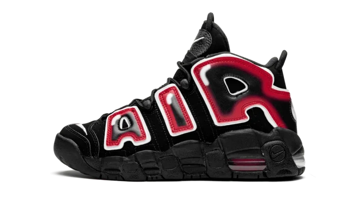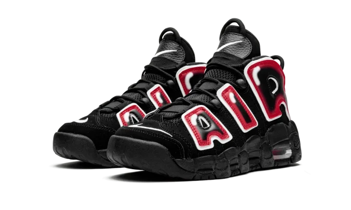 The Nike Air More Uptempo serves up a grade school sneaker with an eye-catching color combination, one that especially appeals to basketball fans. The big kids' high-top sneaker is crafted with suede, mesh, and leather materials. Black covers the upper and sole of the shoe, while a gigantic "AIR" design drapes over the entire upper. The letters are designed in a graffiti style with black at the center, red surrounding the black, and white trim along the outside. The sole is cushioned with a Nike Air unit.